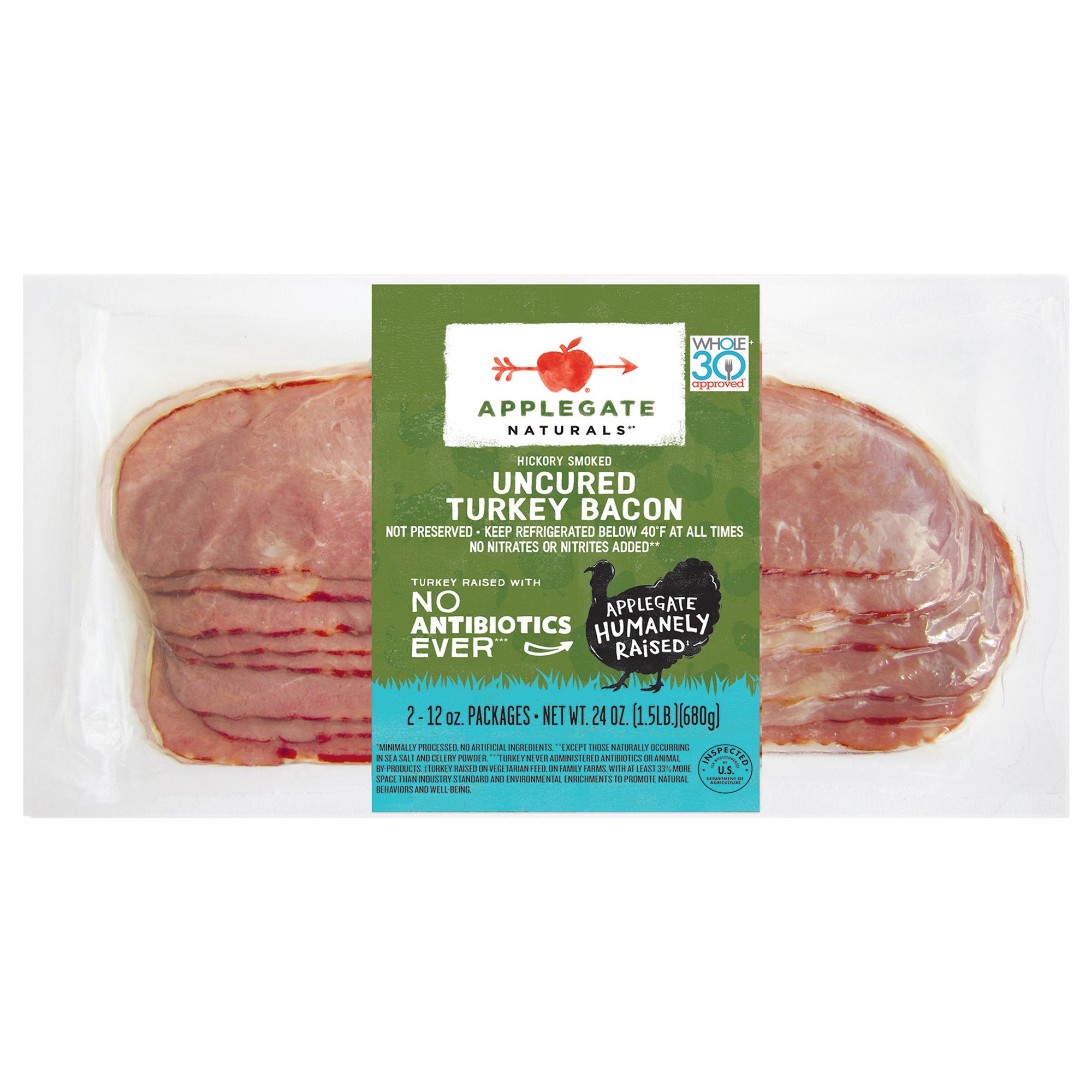 Applegate Natural Uncured Turkey Bacon is meaty, smoky, and delicious – it won’t be hard giving up pork, cold turkey. Cook to your desired crispness and serve with breakfast classics, wrap around vegetables, or chop and sprinkle into pastas, soups, and salads. We source from farms where animals are raised with care and respect. We believe this leads to great tasting products and peace of mind— all part of our mission. Changing The Meat We Eat. Whole30 Approved. Gluten and casein free. Not preserved. Turkey raised with no antibiotics ever (Turkey never administered antibiotics or animal by-products). Inspected for Wholesomeness by US Department of Agriculture.