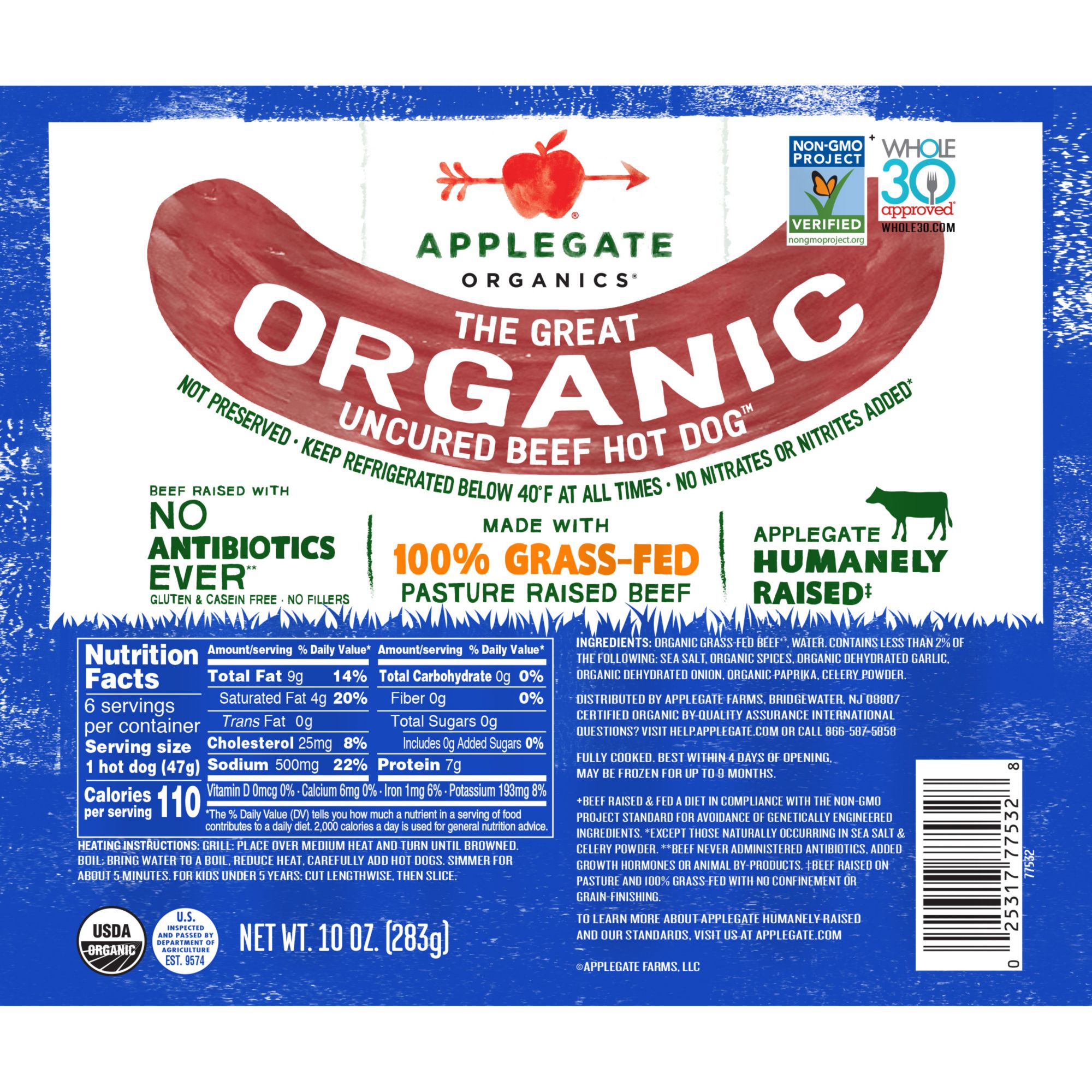 Enjoy delicious Applegate Organics Uncured Beef Hot Dogs made from 100% organic grass-fed beef. The hot dogs are seasoned mildly and lightly smoked, so they're perfect for grilling at a barbecue.