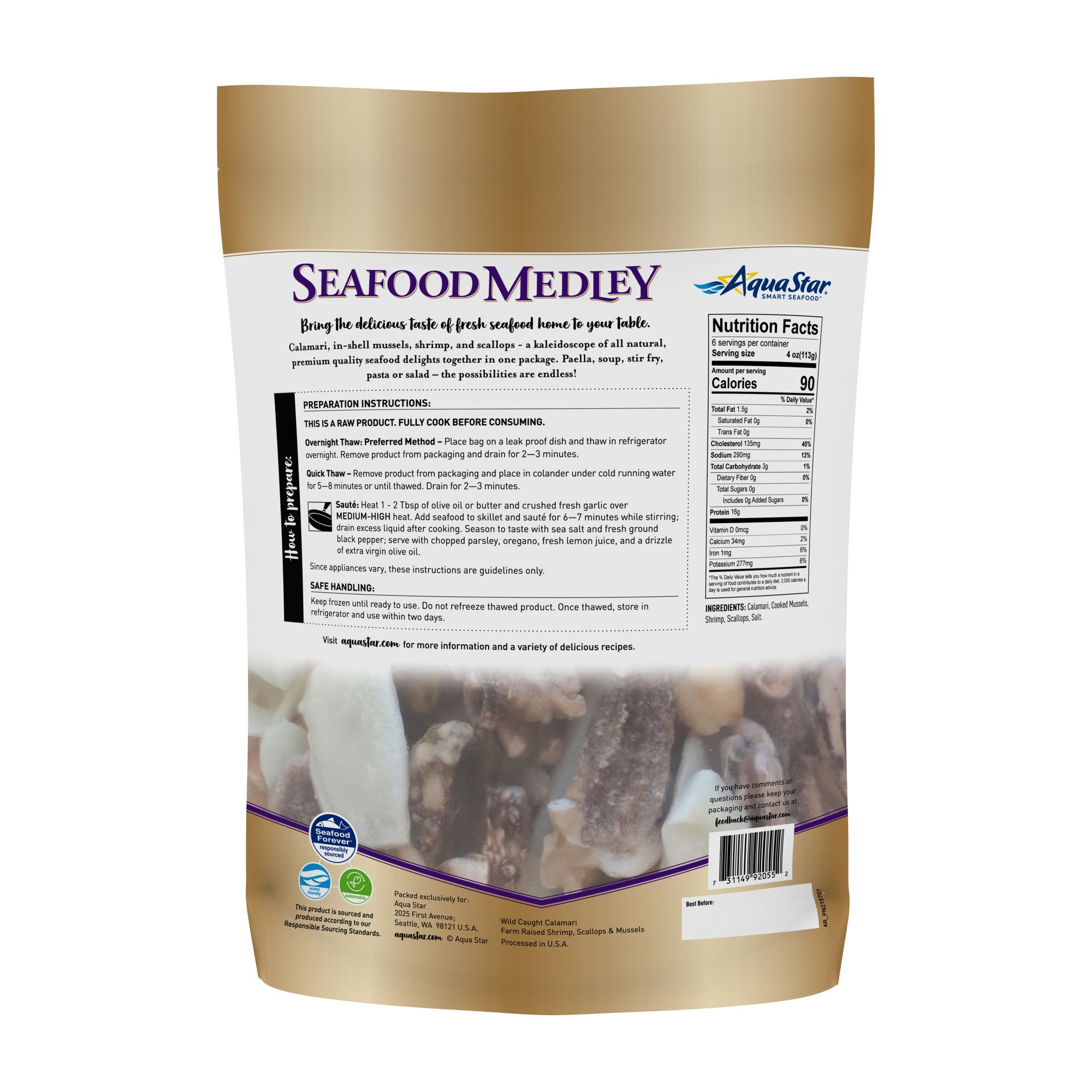 Aqua Star Seafood Medley features a savory mix of calamari, in-shell mussels, shrimp and scallops. It's ideal for pasta sauces, soups or salads.