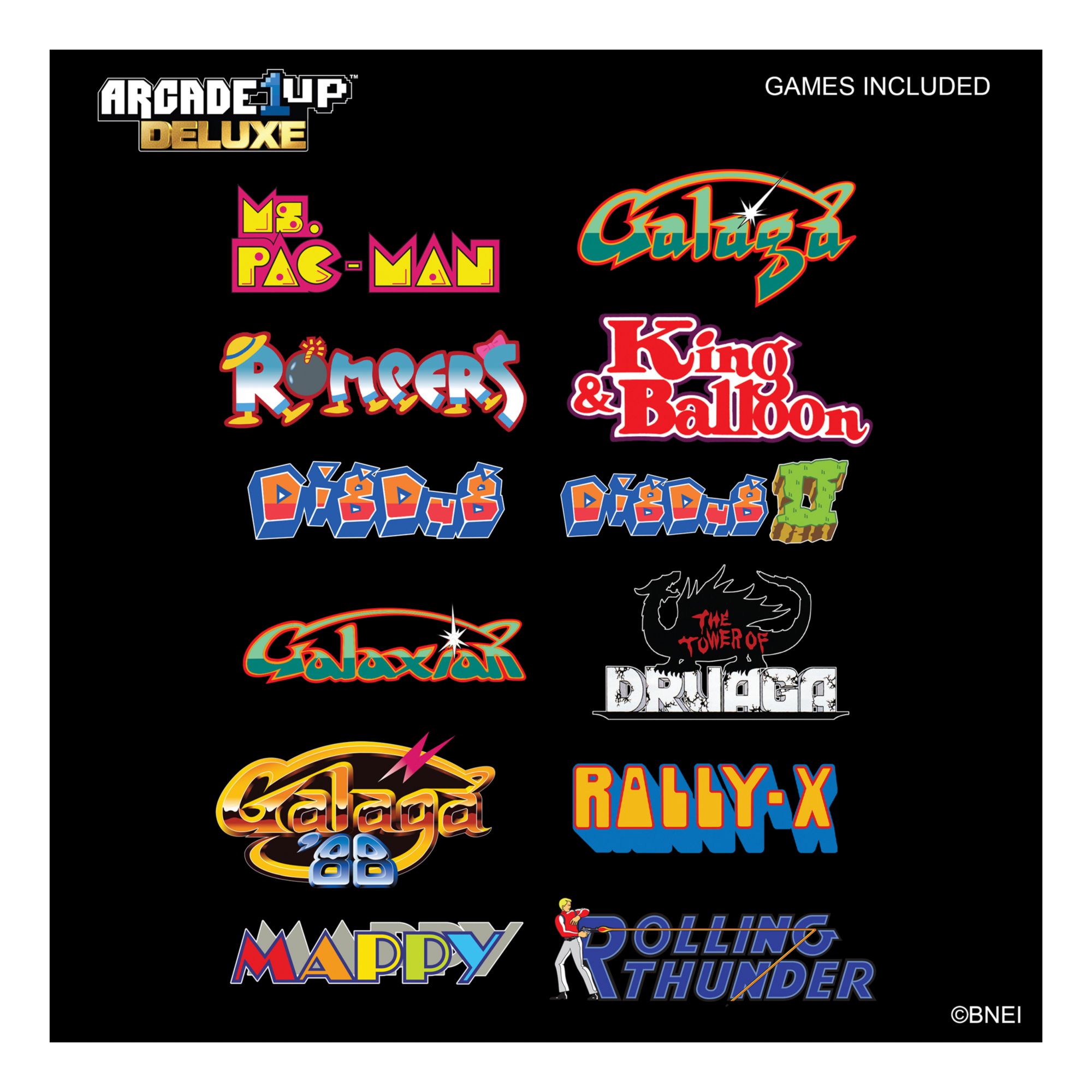 Prince Charles and Lady Diana, Luke and Laura, and Ms. Pac-Man and Galaga all made 1981 a year of iconic unions. With 12 classic games from 1981, you’ve got yourself hours of retro gaming fun. The Deluxe Edition features a crisp 17" LCD that brings all the visual details to life. A real-feel joystick and buttons, and integrated dual speakers make this a perfect at-home retro arcade experience. The sleek, single cabinet design and lit marquee give it an impressive look that would add character and class to any room in the house. The faux front coin door provides that authentic retro look, that will have you instinctively searching your pockets for quarters. And now with Wi-Fi leaderboards, you can post your scores and compete with friends and gamers across the country. Game List: Ms. Pac-man Galaga Galaga'88 Galaxian Dig Dug Dig Dug Ii Mappy Rally-x Rolling Thunder Rompers Tower of Druaga King and Balloon.