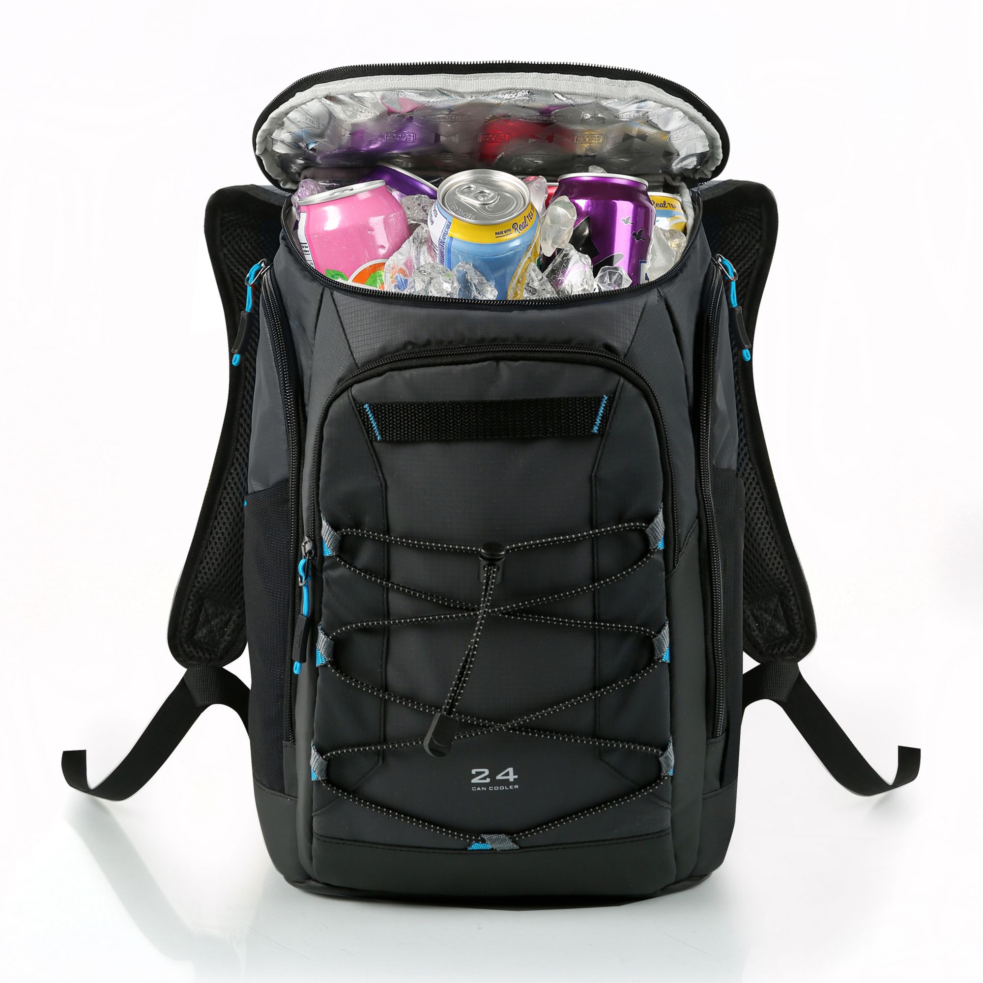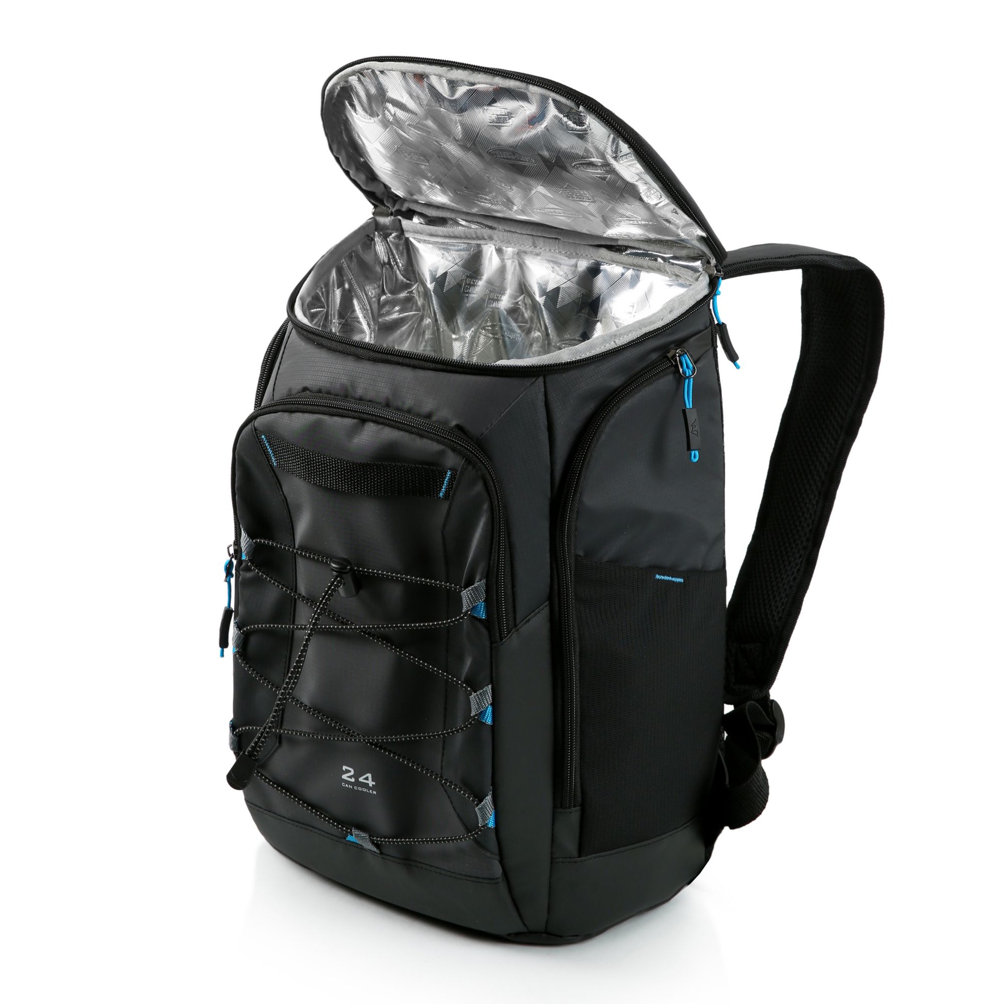 SuperFoam high performance insulation (main compartment) Therma-Flect radiant barrier interior (main compartment) Multiple exterior accessory pockets Elasticized gear straps Padded back panel with vented air channels Adjustable, padded backpack straps Water and stain repellent, wipe-clean exterior Includes one 24-can backpack cooler