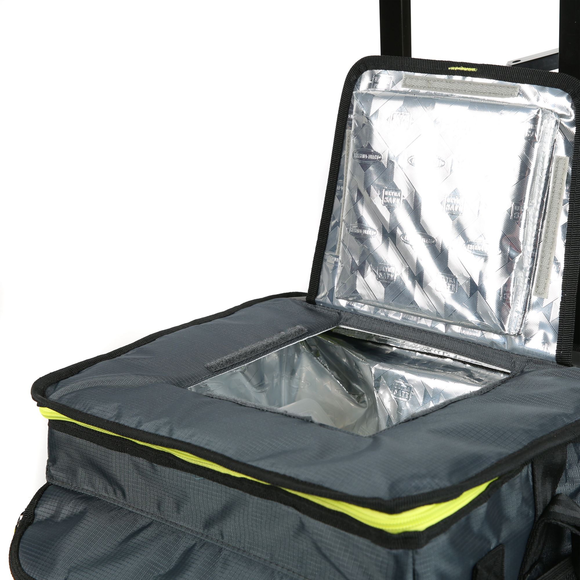 Easy access lid SuperFoam high performance insulation Therma-Flect interior radiant barrier Ultra safe leak-proof, easy clean lining (main compartment) Eight-Can insulated front compartment Padded handles. Adjustable, padded shoulder strap with back saver technology Detachable, foldable all-terrain cart (A.T. cart) cart holds up to 100 lbs./45.35kg.-Can be used to transport boxes, plants, gardening equipment Expandable, extra-wide base with heavy-duty, all-terrain wheels. Retractable, telescopic hook 'n' go handle. Includes one rolling cooler and one detachable all-terrain cart (use with or without cooler)