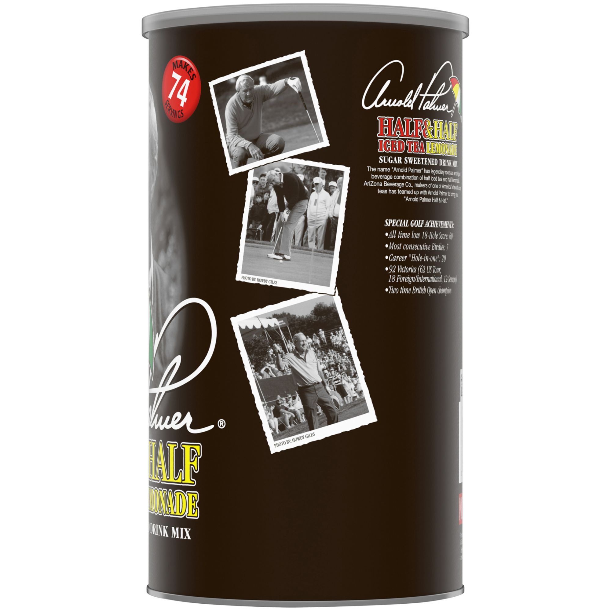 Get ready to enjoy a drink that keeps up with the busiest of lifestyle. The name "Arnold Palmer" has legendary roots in the game of golf as well as the originator of the world-famous beverage combination of half iced tea and half lemonade. Arizona Beverage Co., makers of some of America's favorite iced teas, has teamed up with Arnold Palmer to bring you the refreshing "Arnold Palmer Half & Half" Drink Mix. It’s so easy to make this single-serve drink. Simply add water, stir until it dissolves, and pour into an iced glass for a refreshing take on this classic beverage! Ready in just seconds, take this on-the-go drink with you anywhere. This 73 oz. canister is the ideal way to stock up on a low-calorie drink solution for your family’s home or at your office. Bring the pre-mixed Arnold Palmer drink to the course in a water bottle and enjoy throughout your round. There are so many perfectly portioned pitchers of Arnold Palmer Half & Half to share with family and friends. This iced tea lemonade drink is 100% natural and is made with no preservatives, artificial colors, flavors or sweeteners. Made with a delicious blend of the best black teas, enjoy a refreshingly smooth and flavorful taste.
