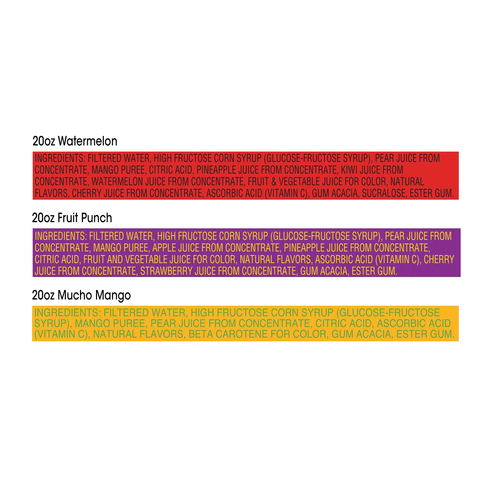 Ingredients: Filtered Water, High Fructose Corn Syrup (Glucose-Fructose Syrup), pear juice from concentrate, mango puree, citric acid, pineapple juice from concentrate, kiwi juice from concentrate, watermelon juice from concentrate, fruit and vegetable juice for color, natural flavors, ascorbic acid (Vitamin C), gum acacia, sucralose, ester gum.