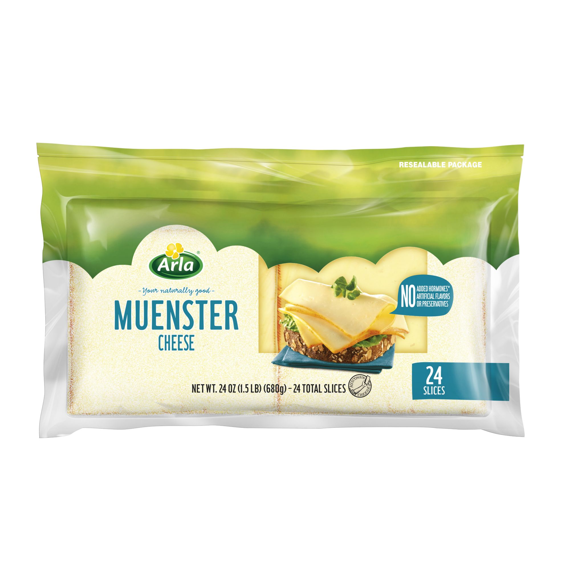 A snack-time favorite, the Arla Dofino 24 Oz. Muenster Cheese Slices are easily paired with crunchy crackers or your favorite sandwich bread. This smooth, soft cheese offers a mild flavor and a bold look thanks to its unique, orange rind.