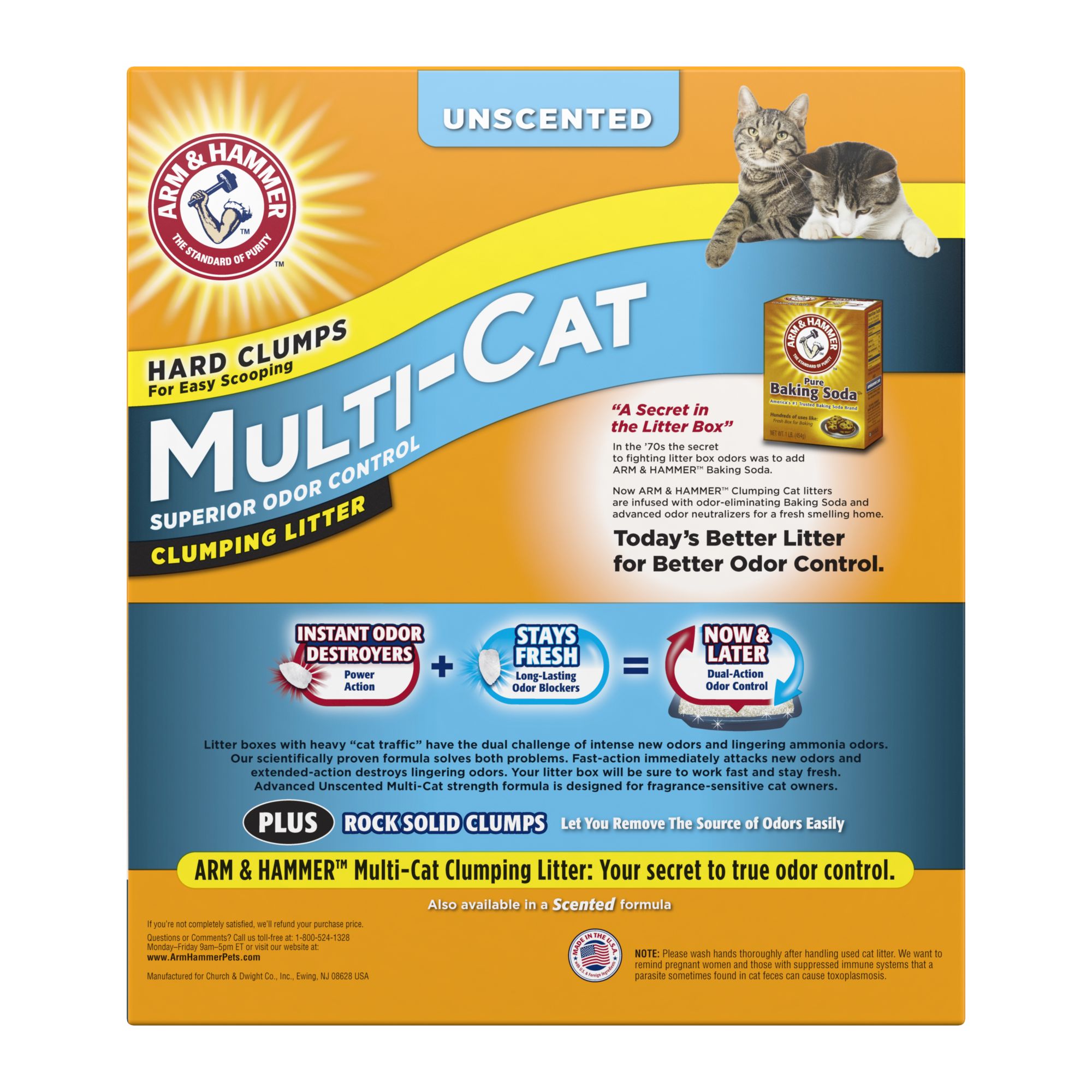 Arm & Hammer Multi-Cat Unscented Clumping Litter combines instant odor destroyers and baking soda to eliminate tough odors. This formula is ideal for multiple cat households and is unscented for fragrance-sensitive cats and owners. Litter boxes with heavy "cat traffic" have the dual challenge of intense new odors and lingering ammonia odors. The scientifically proven formula solves both of these problems. Rock-solid clumps let you remove the source of odors easily every time your cat uses the kitty litter box. Fast action immediately attacks new odors and extended action destroys lingering odors. Your litter box will be sure to work fast and stay fresh.