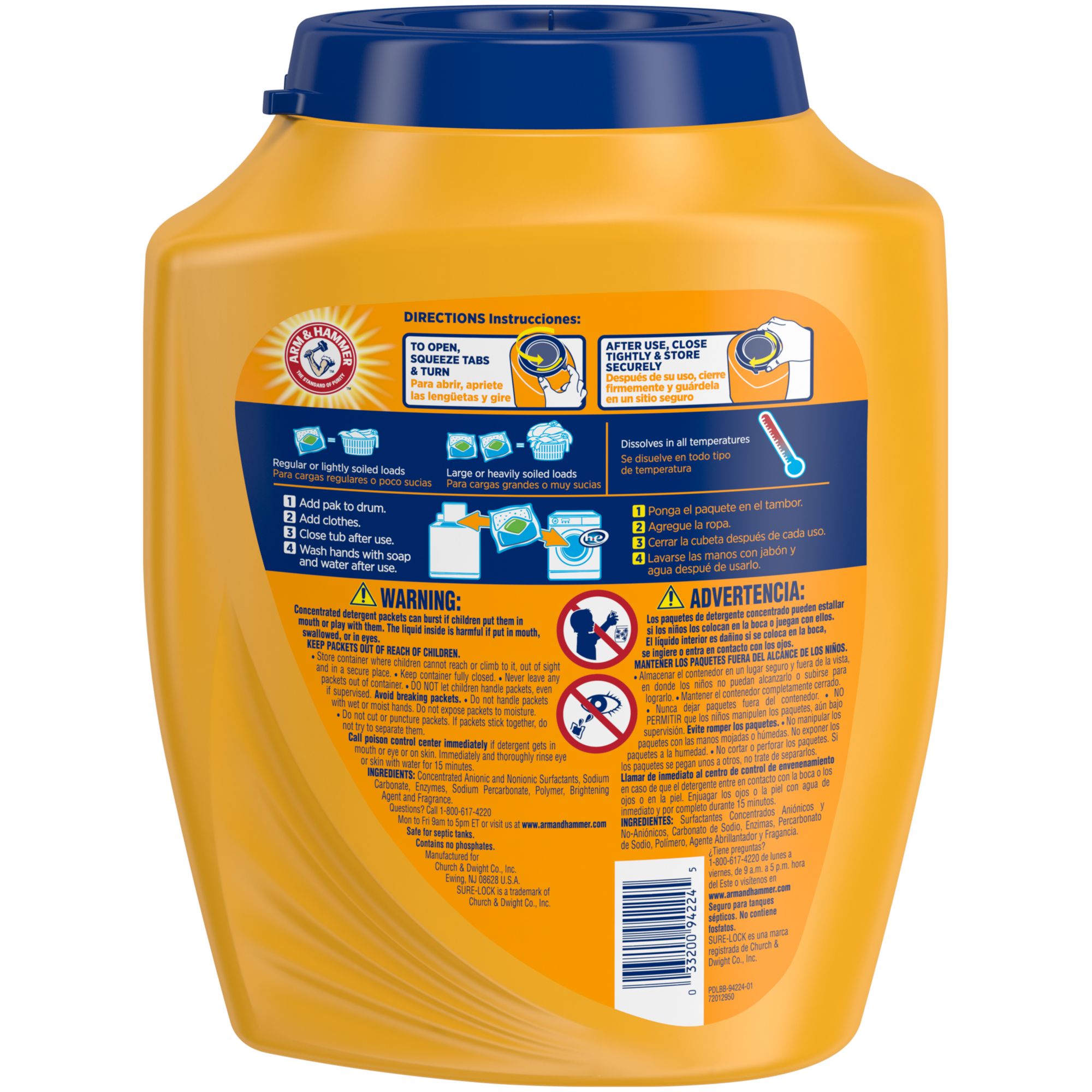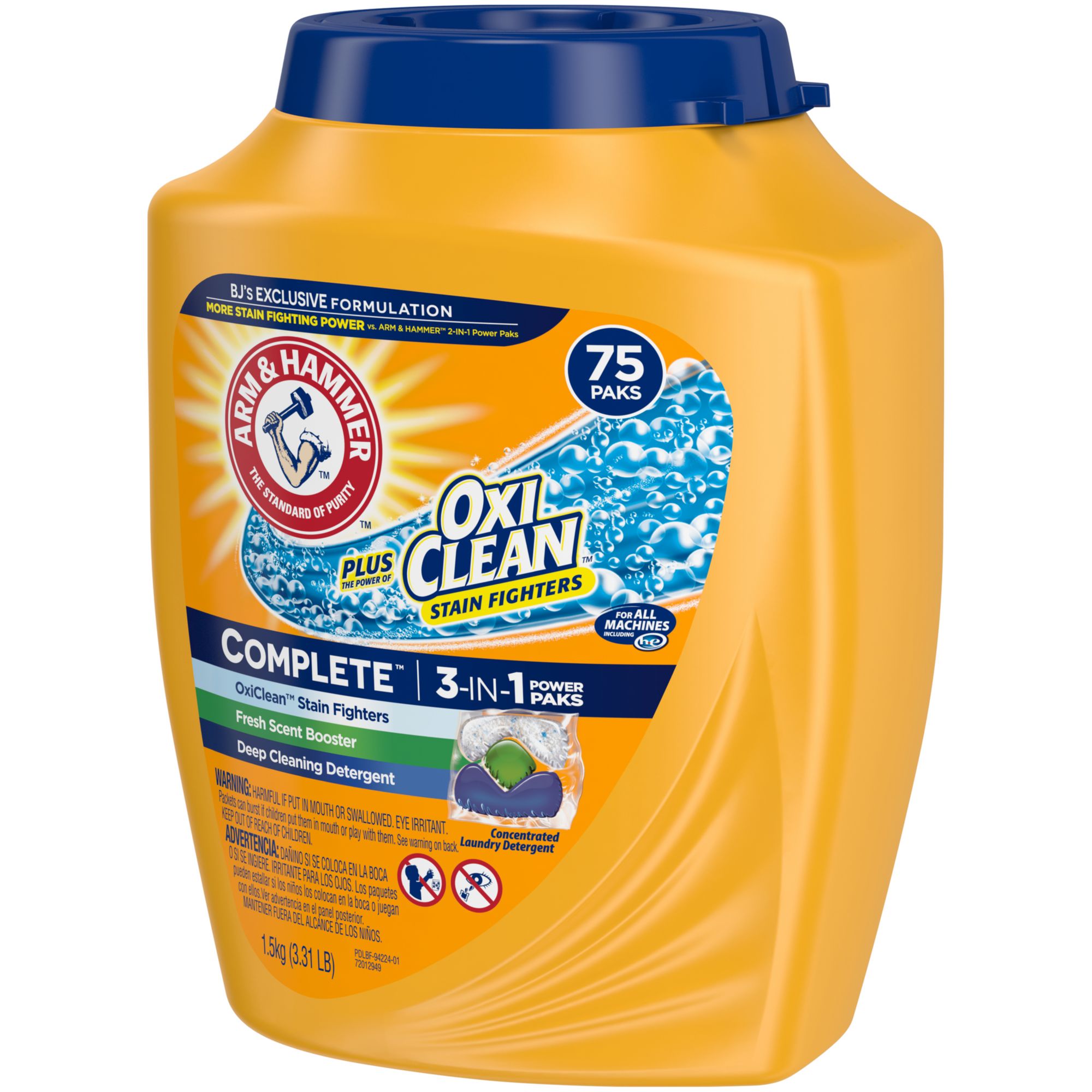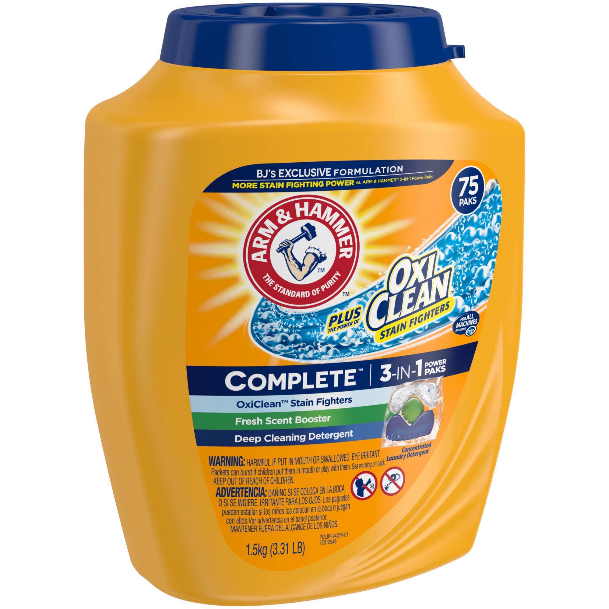 Arm & Hammer Oxi Clean Detergent includes conveniently concentrated detergent paks made with the cleaning and freshening power of Arm & Hammer baking soda. Powered by OxiClean, it offers deep cleaning action. Included is a 75-count of detergent paks.
