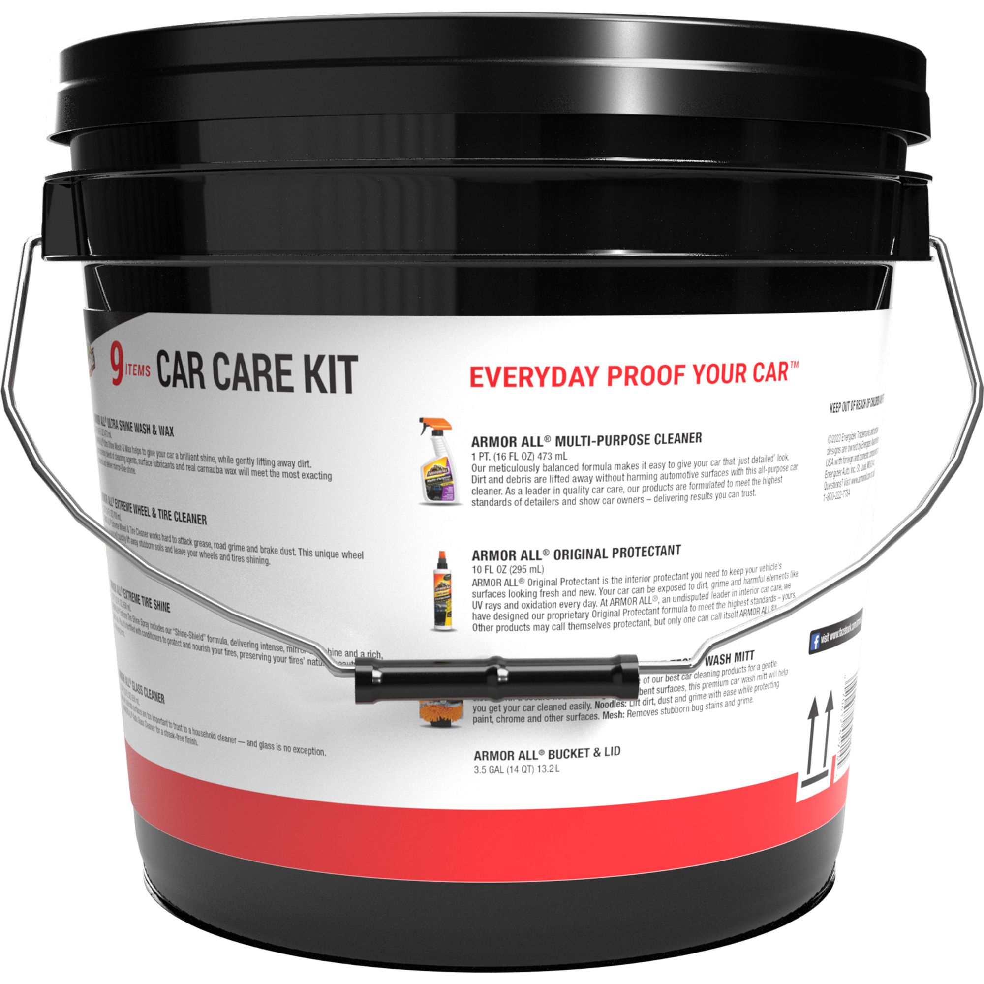 Includes 16 oz. Armor All wash n wax, Armor All glass trigger spray, Armor All multi-purpose cleaner, 10 oz. Armor All protectant pump, Armor All extreme wheel and tire cleaner, Armor All extreme tire shine, Armor All 2-n-1 wash mitt, bucket and lid