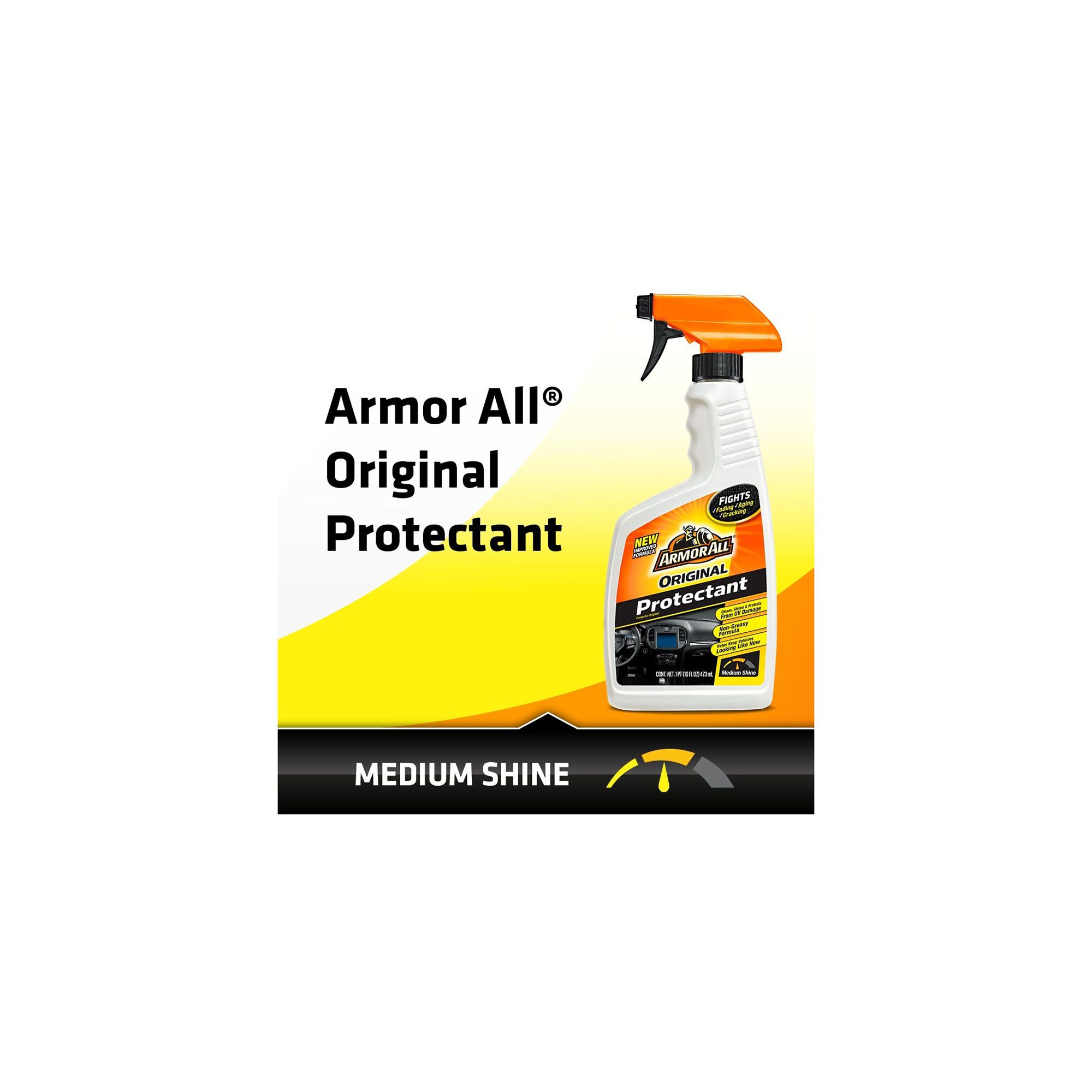 Restore that rich, deep look to your car with Armor All Original Protectant Spray. This original formula goes to work as a dirt and dust cleaner while also protecting surfaces against UV damage. By fighting fading and cracking, Armor All protectant helps your car stay looking as good as it did new. This non-greasy formula adds shine, too, revitalizing the appearance of surfaces throughout your interior. Spray on vinyl, plastic and rubber, including the dashboard, console, door panels and vinyl seats. Then simply wipe off. This UV protectant is also great on exterior trim and rubber, including bumpers, tires and tire trim. Use the bonus pack of cleaning car wipes as a dust cleaner that tackles any surface you missed, including leather, fabric and carpets. With cleaning wipes and car protectant from Armor All, you get trusted results.