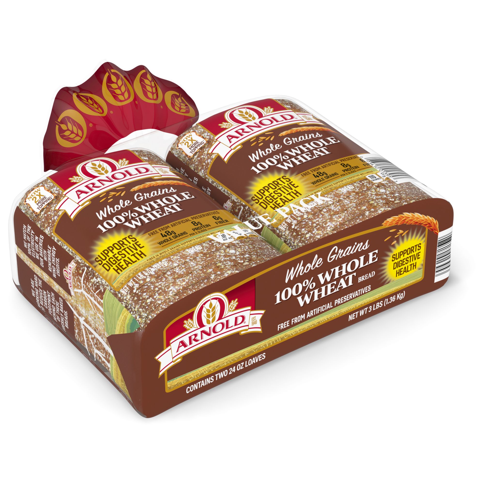 Arnold 100% Wheat bread is filled with nutritional ingredients like whole wheat, sunflower seeds, oats, barley, and brown rice. Arnold bread is free from artificial preservatives, colors and flavors with no added nonsense. Enjoy a slice of delicious and healthy Arnold wheat bread.