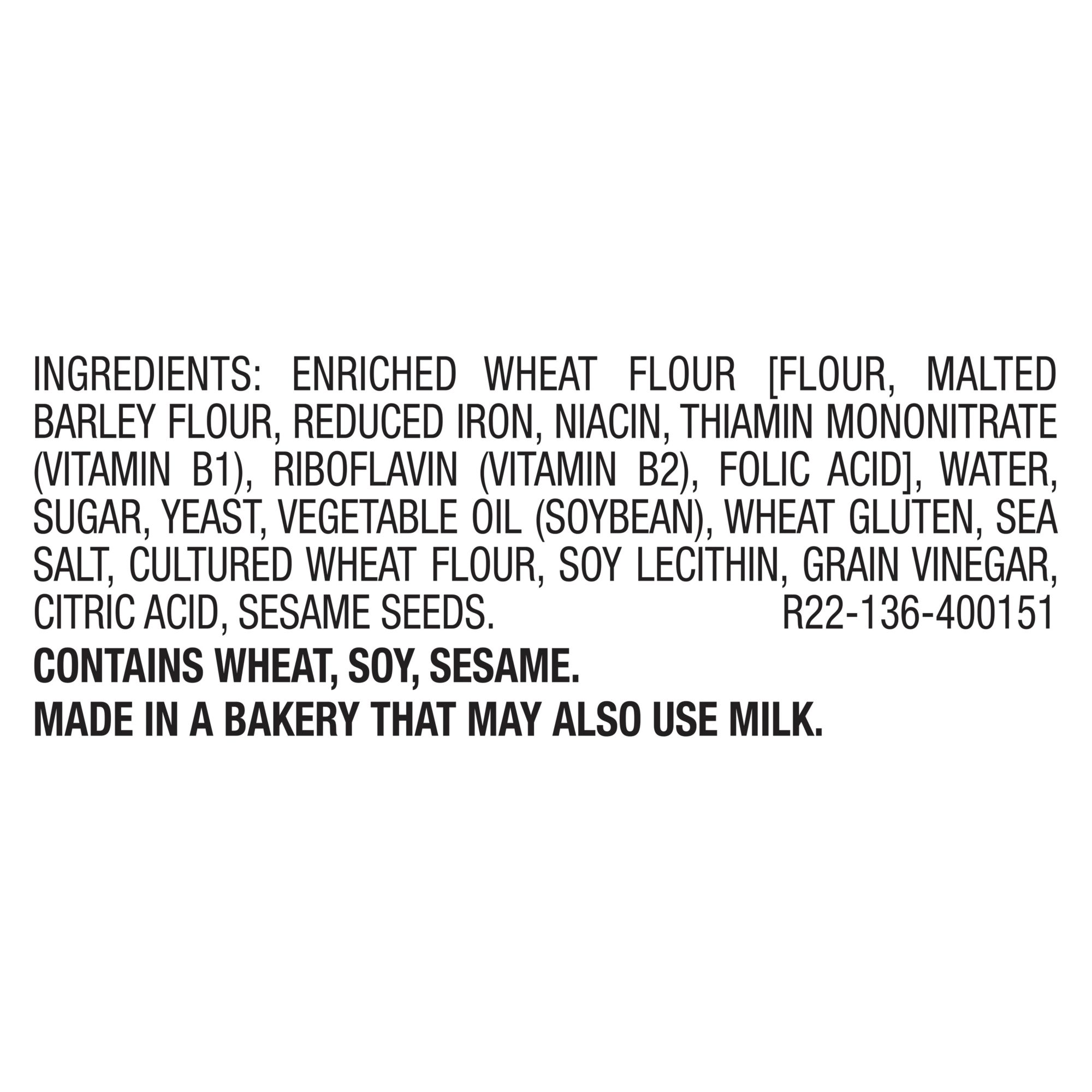 Ingredients Enriched Wheat Flour [Flour, Malted Barley Flour, Reduced Iron, Niacin, Thiamin Mononitrate (Vitamin B1), Riboflavin (Vitamin B2), Folic Acid], Water, Sugar, Yeast, Vegetable Oil (Soybean), Wheat Gluten, Sea Salt, Cultured Wheat Flour, Soy Lecithin, Grain Vinegar, Citric Acid, Sesame Seeds.
