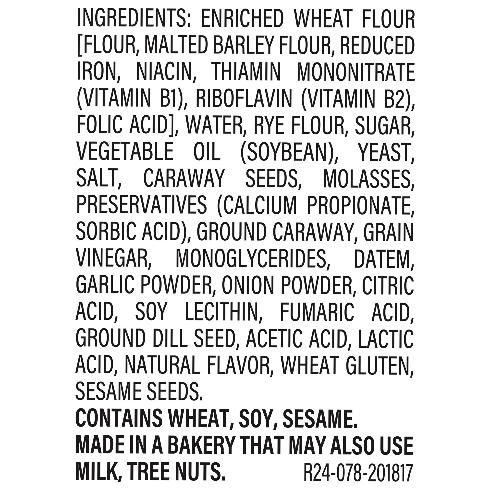Ingredients: Enriched Wheat Flour [Flour, Malted Barley Flour, Reduced Iron, Niacin, Thiamin Mononitrate, Riboflavin, Folic Acid], Water, Rye Flour, Sugar, Vegetable Oil (Soybean), Yeast, Salt, Caraway Seeds, Molasses, Preservatives [Calcium Propionate, Sorbic Acid], Ground Caraway, Grain Vinegar, Monoglycerides, Datem, Garlic Powder, Onion Powder, Citric Acid, Soy Lecithin, Fumaric Acid, Ground Dill Seed, Acetic Acid, Lactic Acid, Natural Flavor, Wheat Gluten, Sesame Seeds.