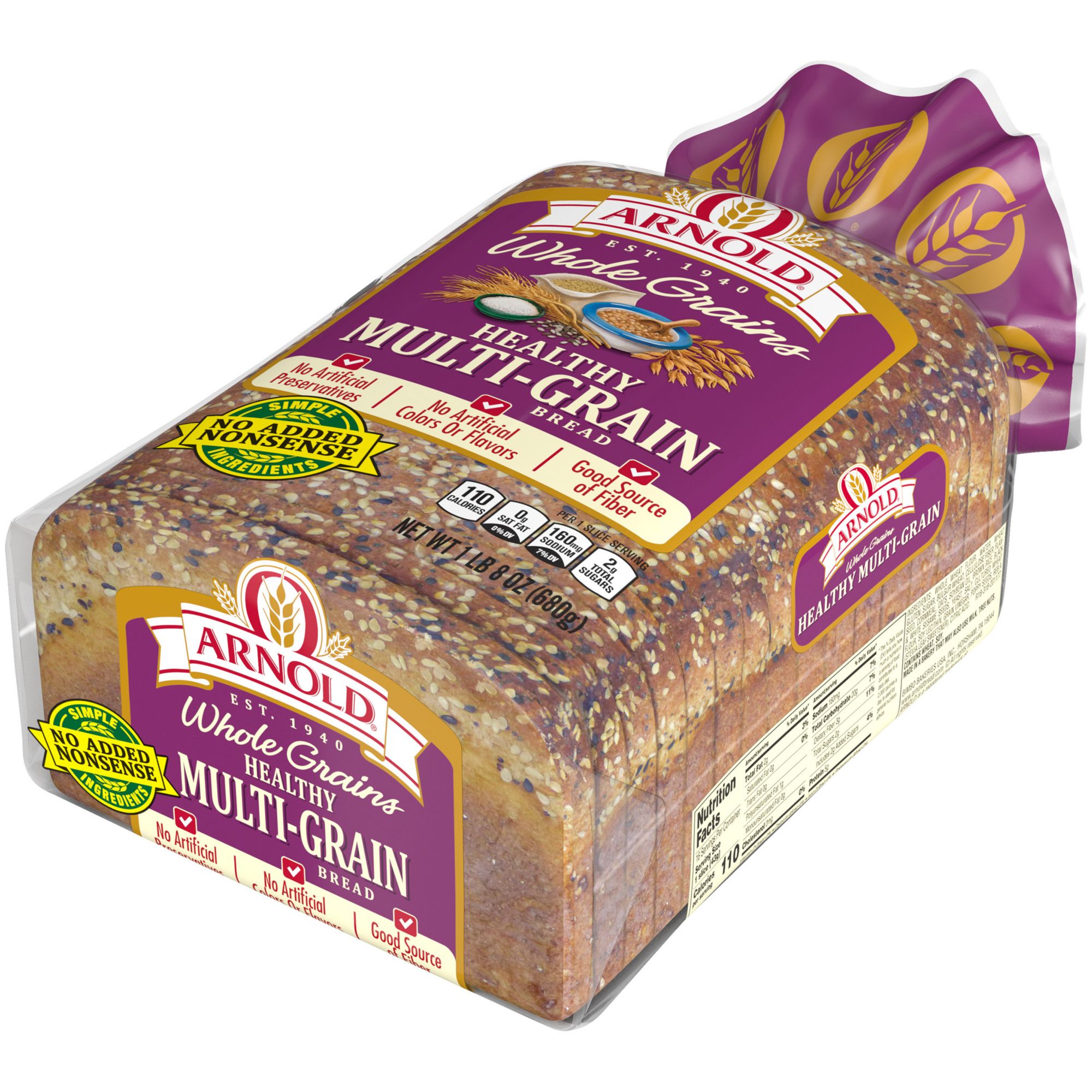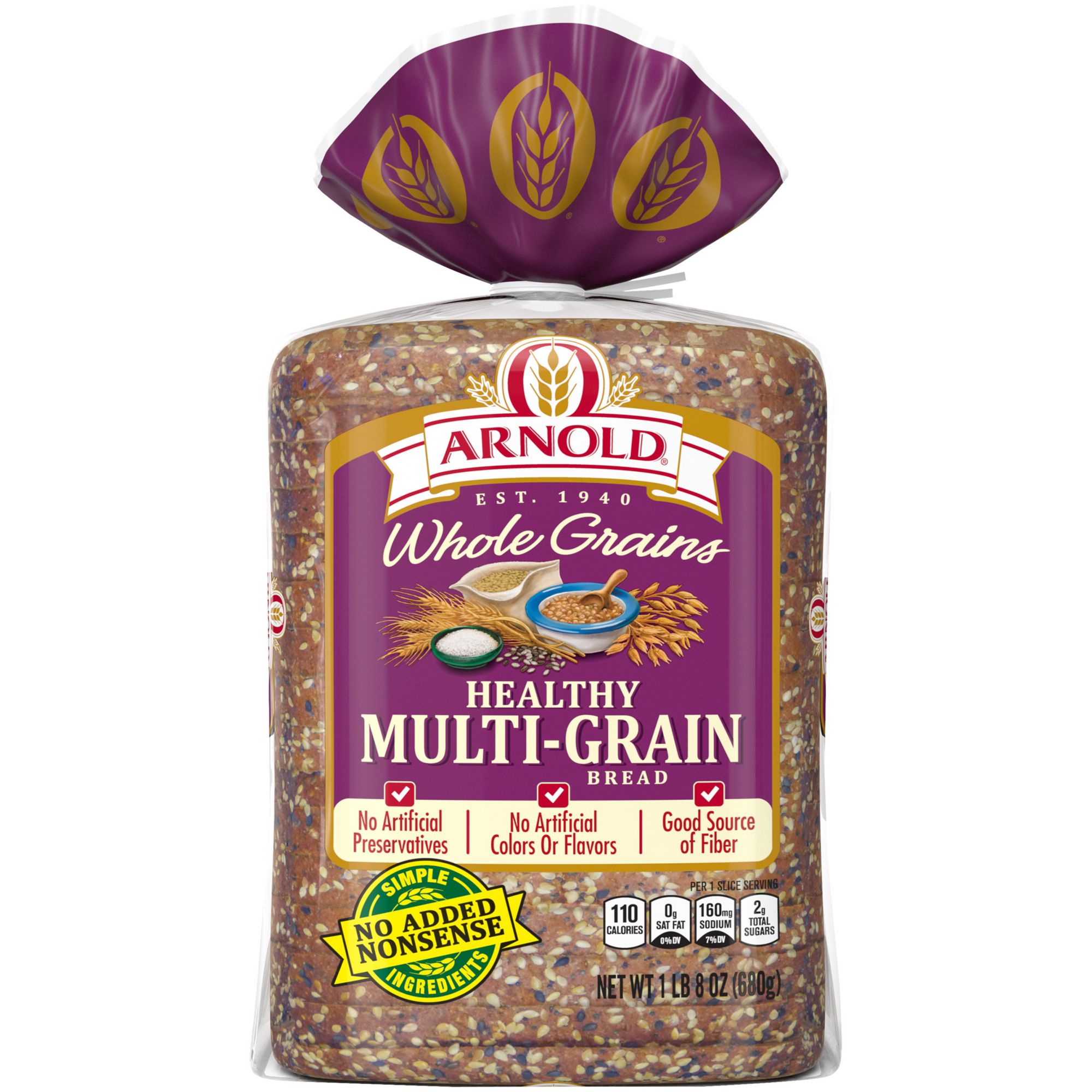 Arnold Whole Grains Healthy Multi-Grain Bread has 37g of whole grains and seven grams of fiber in two slices. Its rich flavor makes a healthy and tasty sandwich.