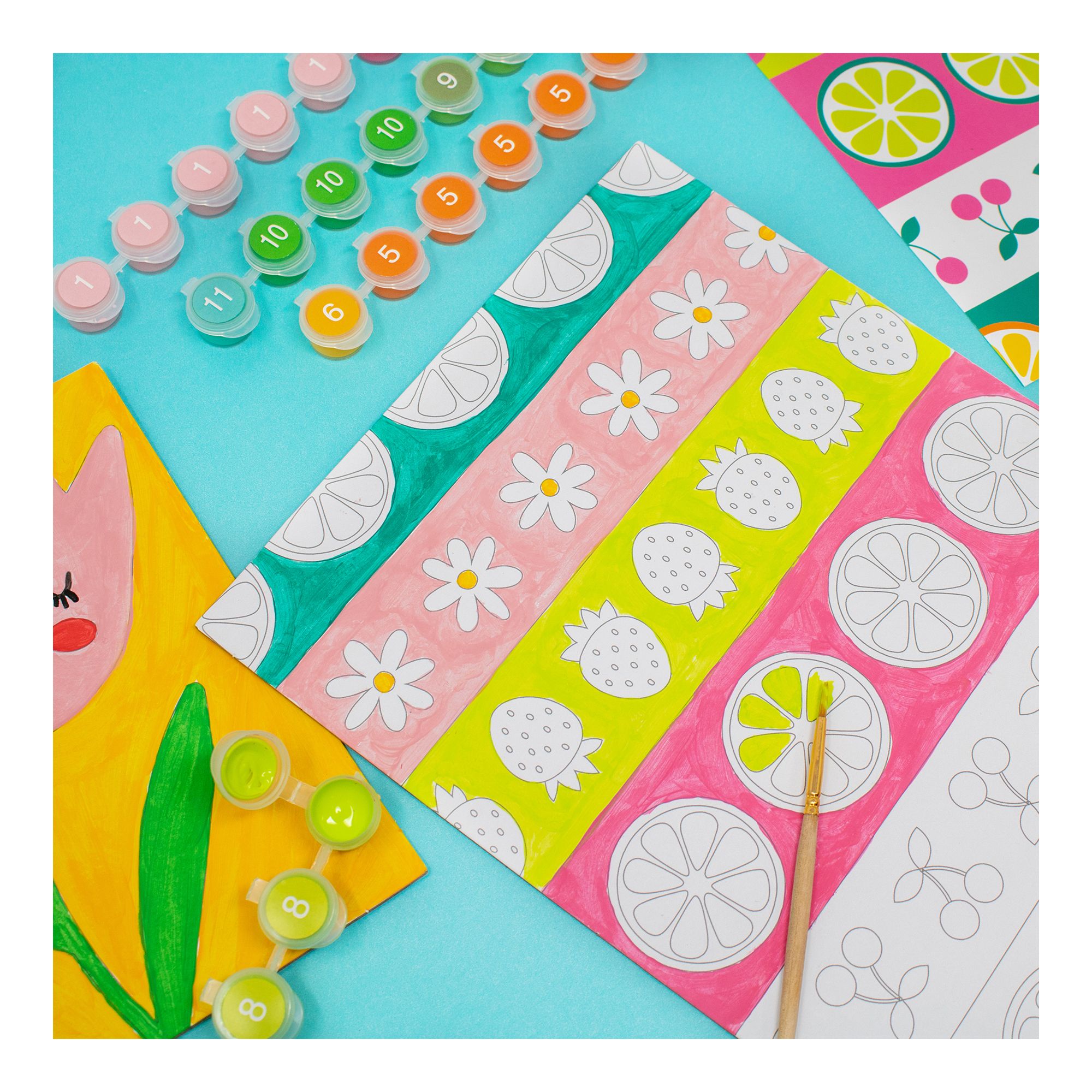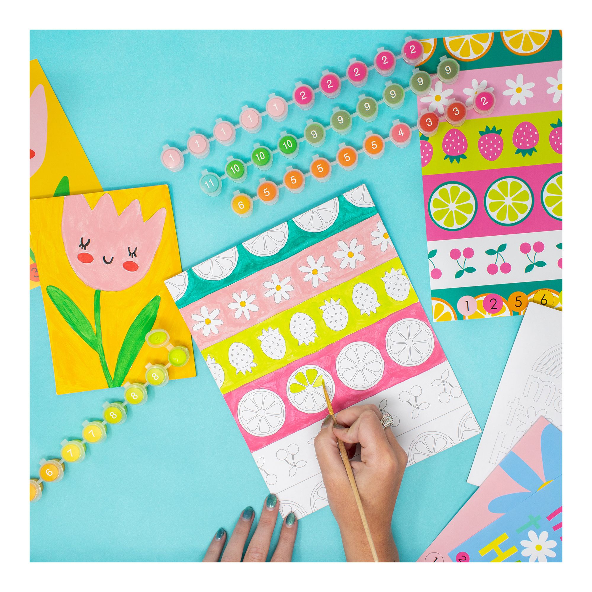 Unleash your inner artist with the Art 101 Paint by Number 99 Piece Activity Kit. This kit has eight total paint-by-number activities for hours of creative fun. Included are four numbered designs sized at 8" x 10", and four more designs sized at 5" x 7". To bring the designs to life, follow the included painting color keys and simply match the number on the panel to one of the 80 labeled paint pods of vibrant and pigmented paints. Fill in each numbered section with its corresponding paint color. This activity set is perfect for any young artist looking to develop their artistic confidence and painting skills.