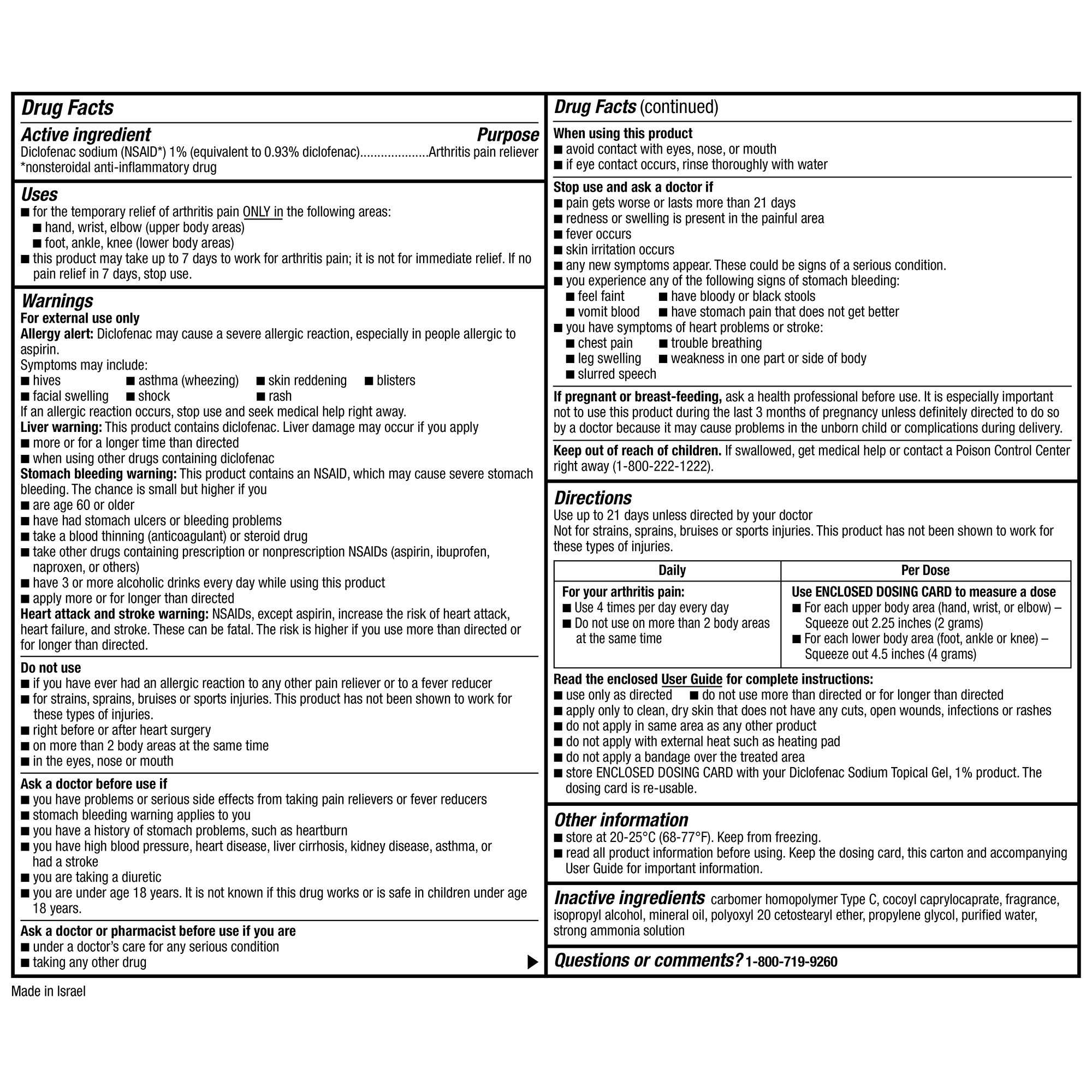 Instructions for use - Directions: use up to 21 days unless directed by your doctor. Not for strains, sprains, bruises, or sports injuries. This product has not been shown to work for these types of injuries. Daily: for your arthritis pain: use four times per day every day; do not use on more than two body areas at the same time. Per dose: use enclosed dosing card to measure a dose: for each upper body area (hand, wrist, or elbow) – squeeze out 2.25" (2g); for each lower body area (foot, ankle, or knee) – squeeze out 4.5" (4g). Read the enclosed user guide for complete instructions: use only as directed; do not use more than directed or for longer than directed; apply only to clean, dry skin that does not have any cuts, open wounds, infections, or rashes; do not apply in the same area as any other product; do not apply with external heat such as heating pad; do not apply a bandage over the treated area; store enclosed dosing card with your diclofenac sodium topical gel, 1% product. The dosing card is re-usable. How to use: for arthritis pain only. Use four times a day. May take up to seven days to work for your arthritis pain. For use on no more than two body areas. Use up to 21 days unless directed by your doctor. See product labeling for full directions prior to use.