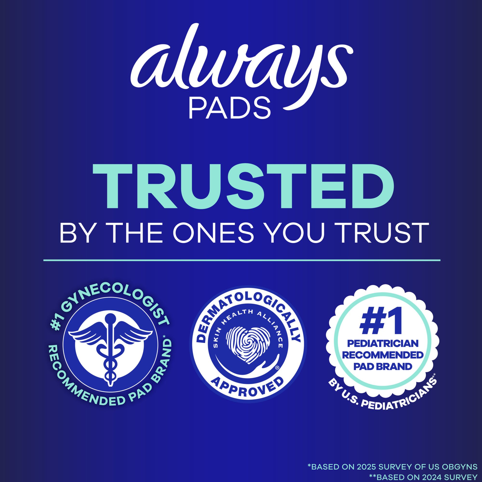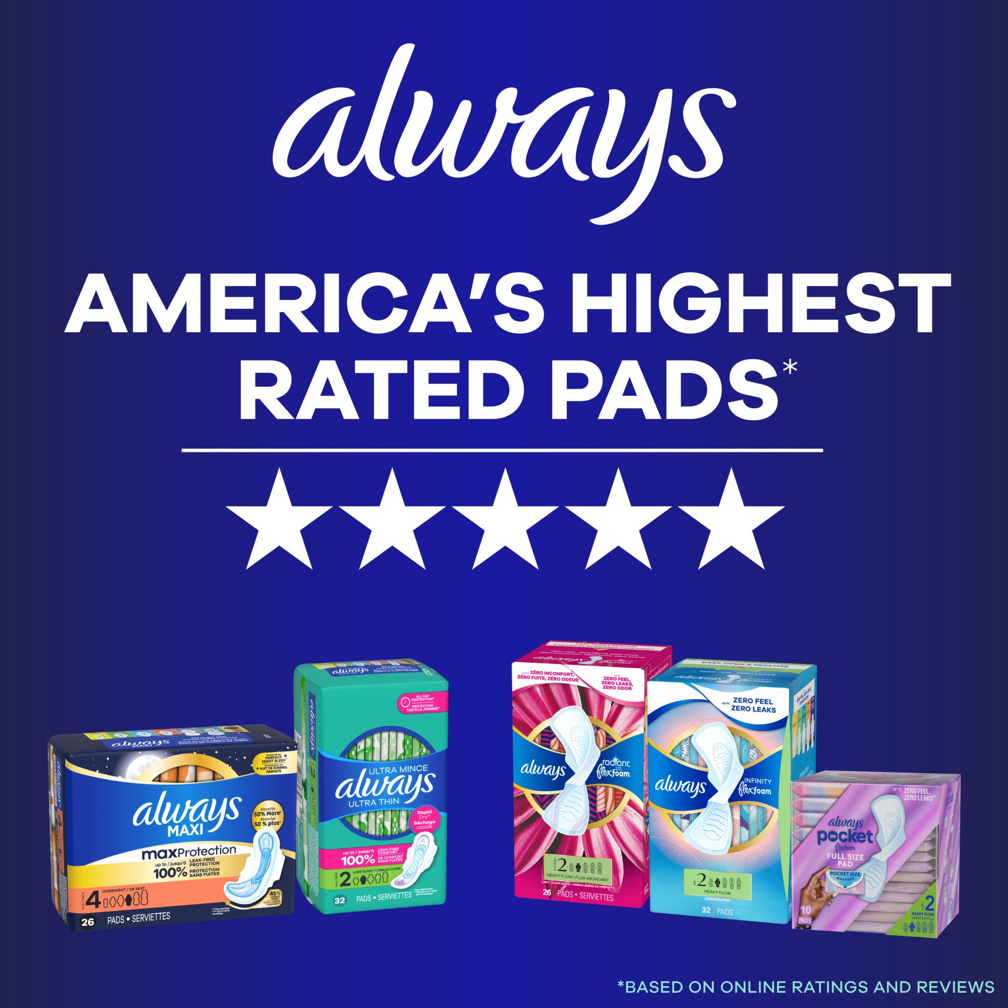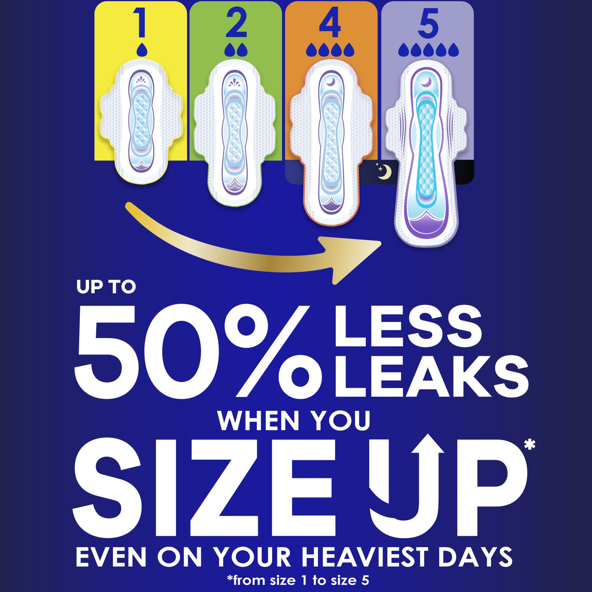 Always Ultra Thin Overnight Pads provide you with a perfect night's sleep with 75% more back coverage (versus Always Ultra Thin Regular) for up to 100% leak-free comfort, no matter how you sleep. Are you ready for the unexpected gush? Always Ultra Thin is! With RapidDRY technology, Always Ultra Thin absorbs gushes 3X faster (Always Ultra Thin Size 2 versus leading Size 2 store brand pad) to give you that cleaner, drier, fresher pad feeling. And it does that all day long. Always Ultra Thin is also equipped with a LeakGUARD core that locks in leaks for long-lasting protection. Plus, OdorLOCK helps prevent unwanted odors to help you feel fresh and clean throughout your day. So, why settle when you can choose Always? Always Ultra Thin. Always Gush Ready. Always Ultra Thin Pads come in a range of sizes from 1 to 5 to fit your flow and size perfectly. When you SIZE UP your pad from Size 1 to Size 5, Always can reduce leaks by up to 50%, even on your heaviest flow days. That's because when you size up from Size 1 to Size 5, you get up to 50% more coverage and up to 75% more absorbency, but the pad remains just as thin and comfortable. We've got your flow covered day and night for up to 100% leak-free comfort. Always Gush Ready.
