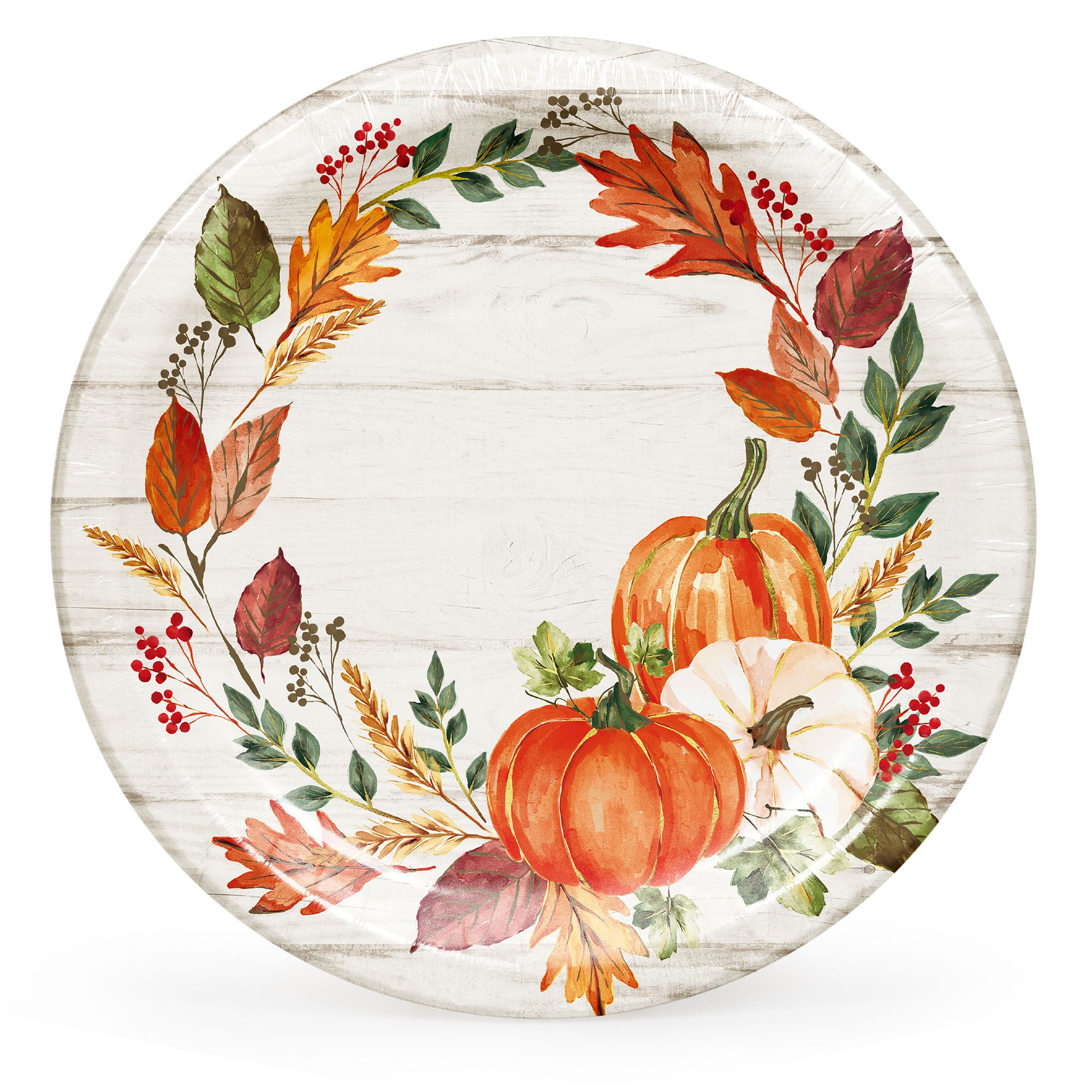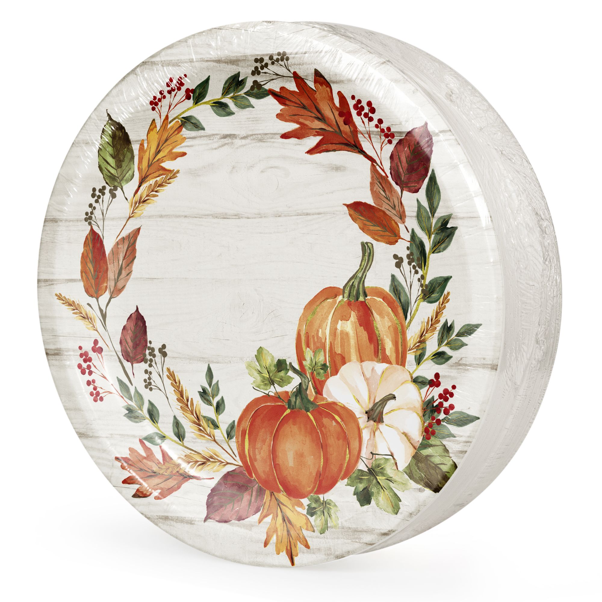 Autumn is in the air! The time to start celebrating family and friends. BJ's excusive 'Autumn's Gift' paper plates, napkins and table covers provide everything you need to set the table for your next Fall get-together or Thanksgiving meal. The bright seasonal design features pumpkins, and colorful fall leaves with a rustic wood theme. Artstyle high quality PERFORMA paper plates are strong enough to handle extra helpings, and are cut resistant and water resistant to prevent leak-through. Pair these 10" round paper plates with coordinating oval plates, dessert plates, napkins, and tablecover for a complete table setting. Disposable for easy clean up and microwave safe! Only available at BJ's.