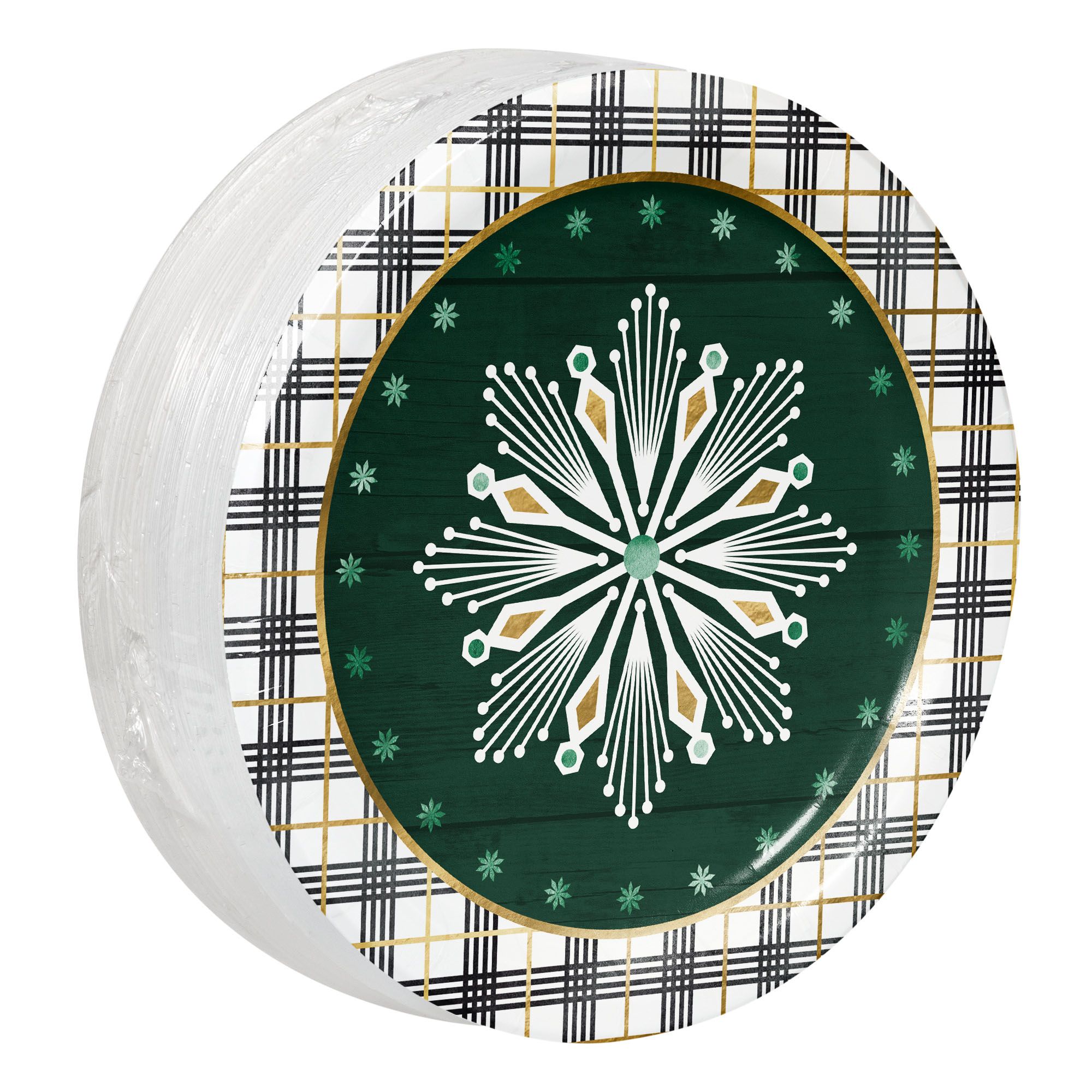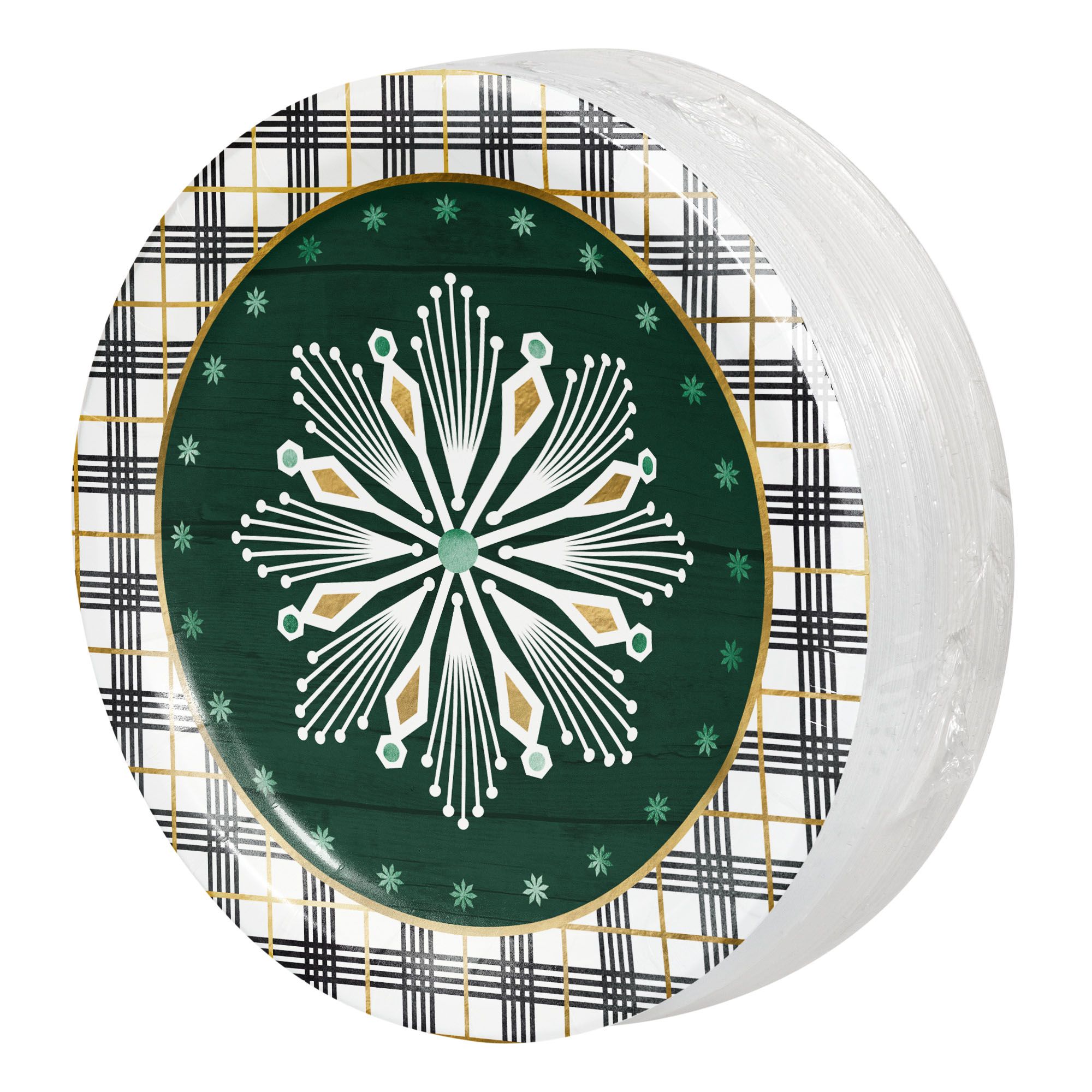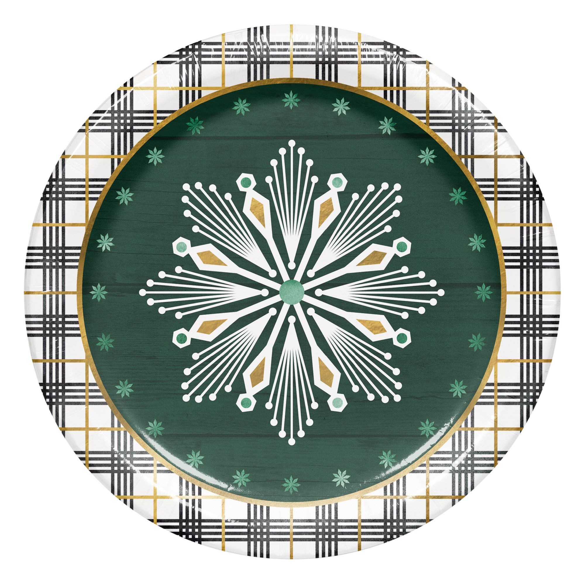 BJ's excusive 'Cozy Lodge' paper plates provide everything you need to set the table for your winter party, Christmas or holiday dinner. The seasonal design adds a casual elegance to any table, featuring evergreens, reindeer, and snowflakes in a cozy woodland setting. The earthy greens and golds deliver a rich color palette. Artstyle high quality Performa paper plates are strong enough to handle extra helpings, are cut resistant and water resistant to prevent leak-through. Pair these 6.875" round paper plates with coordinating oval plates, dinner plates, napkins, and the Winter Holiday table cover for a complete table setting. Disposable for easy clean up and microwave safe.