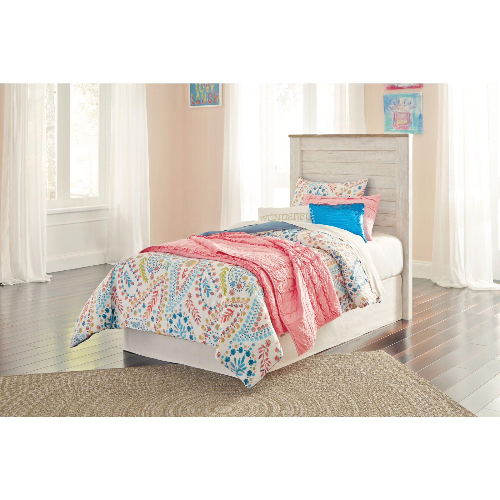 The ultimate look for a beach cottage or shabby chic-inspired retreat, this Willowton panel headboard carries you away to a dreamy time and place. Its driftwood whitewash finish is wonderfully easy on the eyes. Faux plank detailing incorporates a classically rustic touch that’s so homey and comforting. Mattress, bed frame and foundation/box spring sold separately.