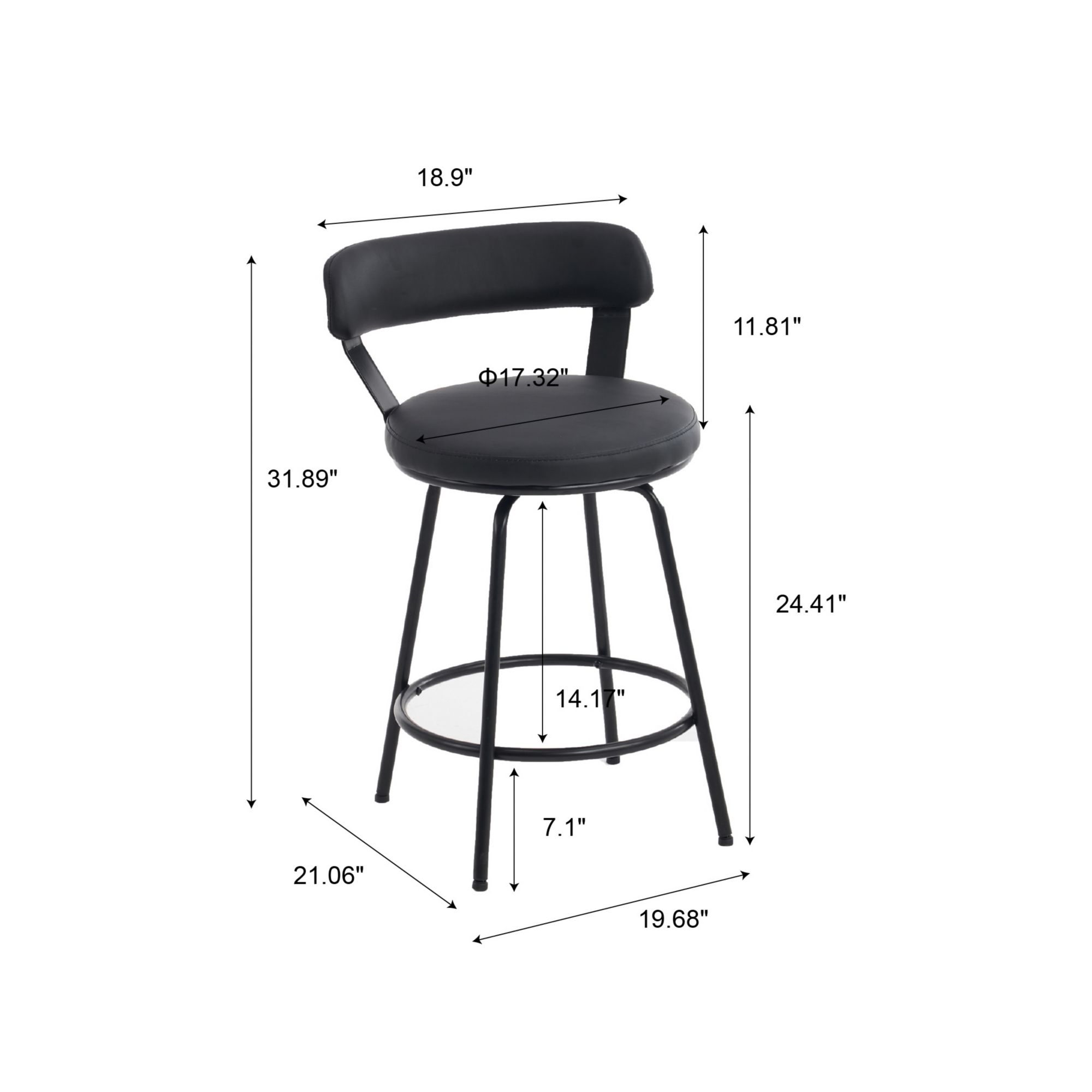 Add a touch of modernity to your kitchen or basement with the set of three 24" Height Low Back Ashley swivel bar stools. The 360° quiet, smooth swivel mechanism allows for ultimate movement. From morning breakfasts to evening cocktails this set of three bar stools is here to complete your space. A durable steel frame with a comfortable leather-like cushion is a quick easy update that will instantly transform your room. The black metal finish and black faux leather look great in most modern, casual, transitional, and contemporary kitchens. The cushion has a high-density foam for maximum comfort and lasting durability. The faux leather is easy to clean spills. Each leg comes with an adjustable foot for uneven floors. Holds up to 250 lbs. Easy-to-follow instructions are included for simple assembly.