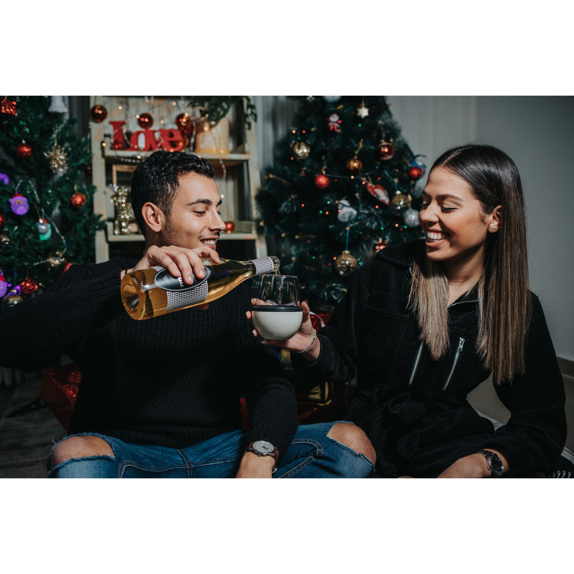 Two pack includes one white kuzie and one black kuzie with two wine glasses