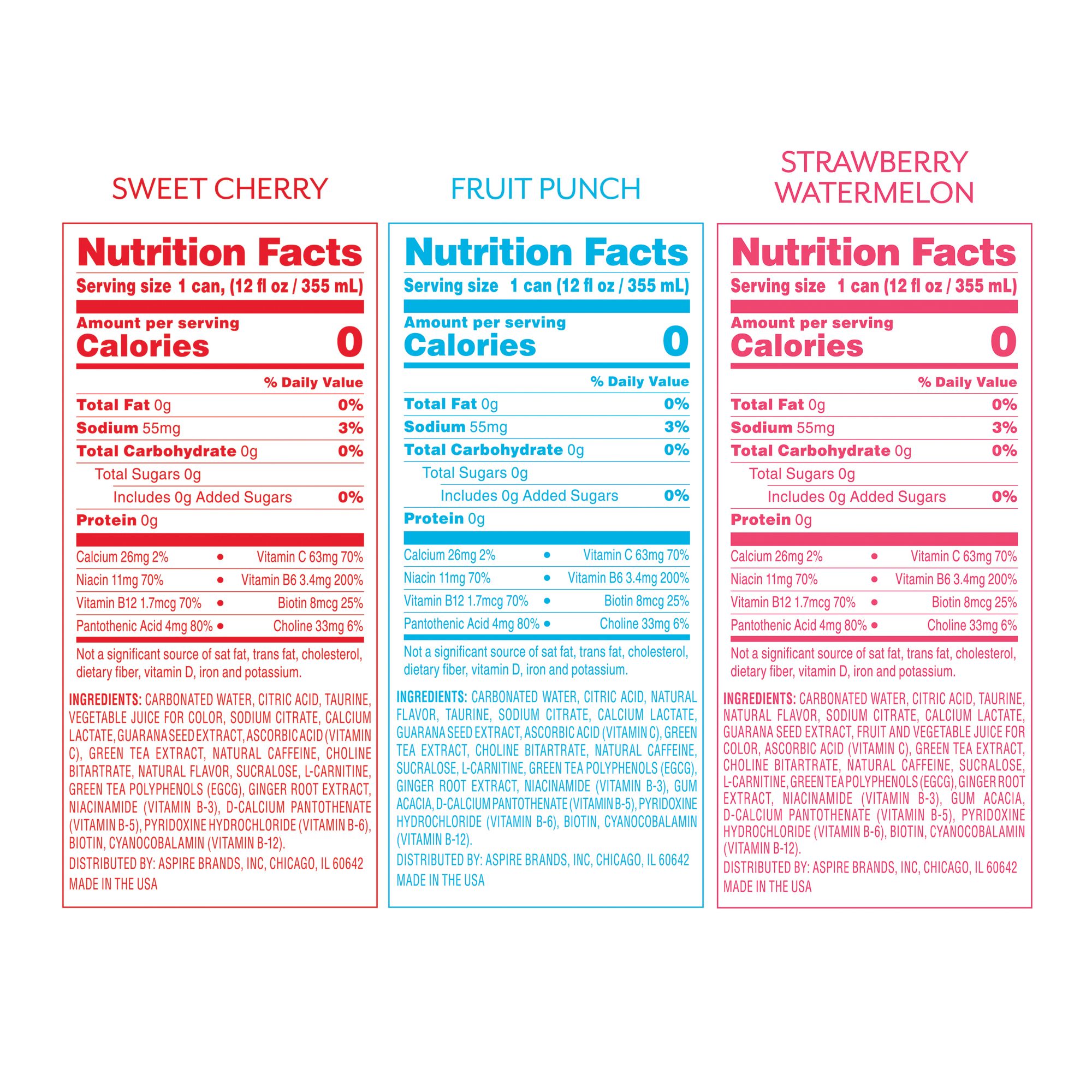 Ingredients: Carbonated Water, Taurine, Citric Acid, Natural Flavor, Malic Acid, Guarana Seed Extract, Fruit and Vegetable Juice for Color, Beta Carotene as Color, Sodium Citrate, Calcium Lactate, Ascorbic Acid (Vitamin C), Green Tea, Green Tea Extract, Choline Bitartrate Natural Flavor, Sucralose, L Carnitine, Green Tea Polyphenols (EGCG), Ginger Root Extract, Niacinamide (Vitamin B-3), Natural Caffeine, Calcium D Pantothenate (Vitamin B-5), Pyridoxine Hydrochloride (Vitamin B-6), Biotin, Cyanocobalamin (Vitamin B-12).