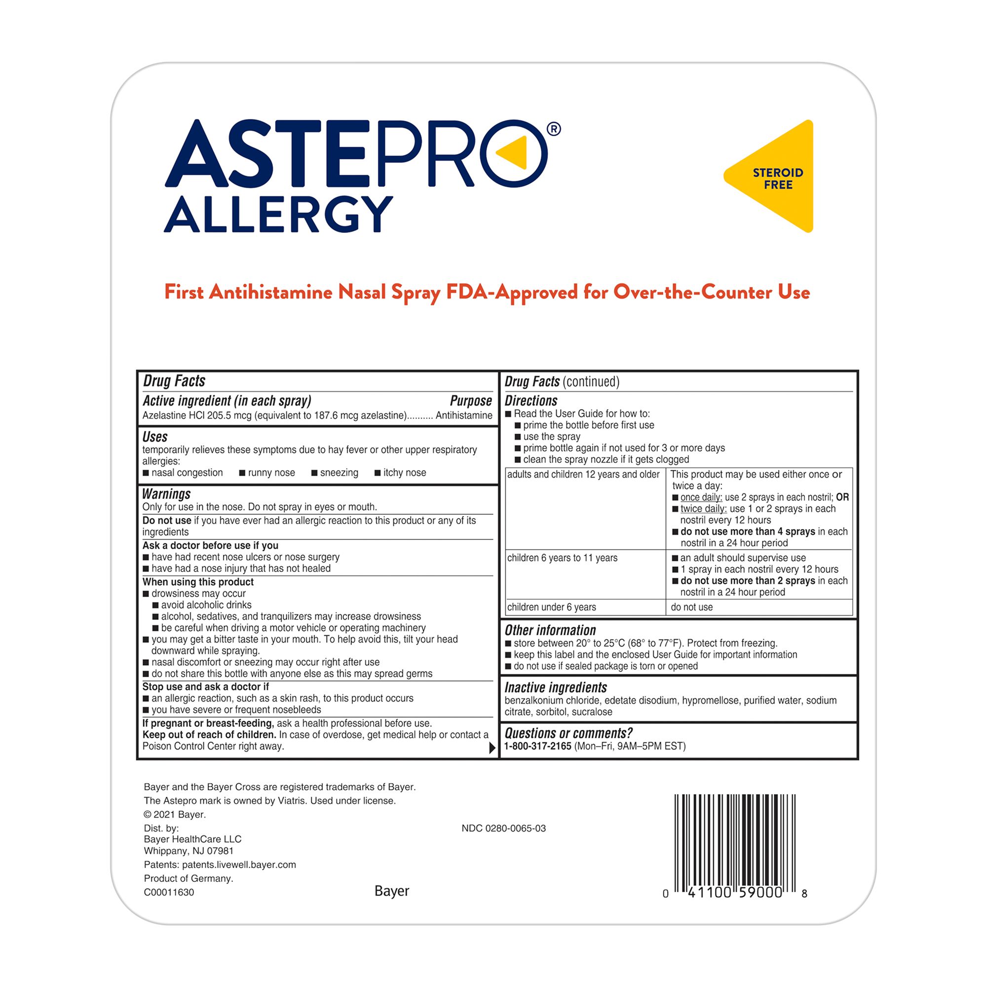 Astepro Allergy is the first and only 24 hour, steroid-free nasal spray for allergy relief. While other allergy sprays may take hours to start working on the first day, Astepro full-prescription strength allergy medicine starts working in 30 minutes. This steroid-free allergy spray provides long-lasting allergy relief of indoor and outdoor nasal allergy symptoms, including nasal congestion, runny nose, sneezing, and itchy nose, for up to 24 hours. Astepro Allergy has flexible dosing, so it can be used once or twice daily for allergy relief. One spray contains 205.5 mcg of azelastine HCl.