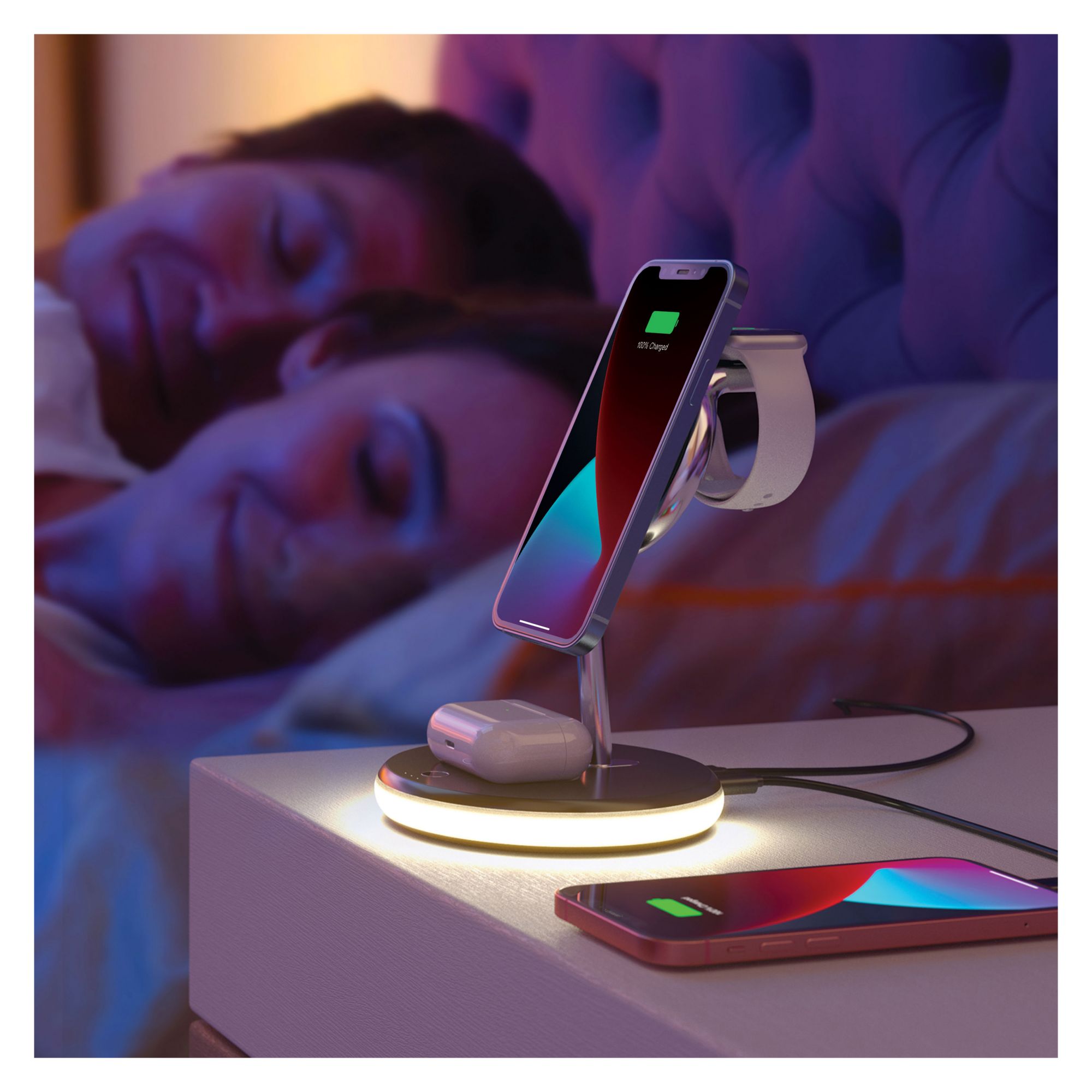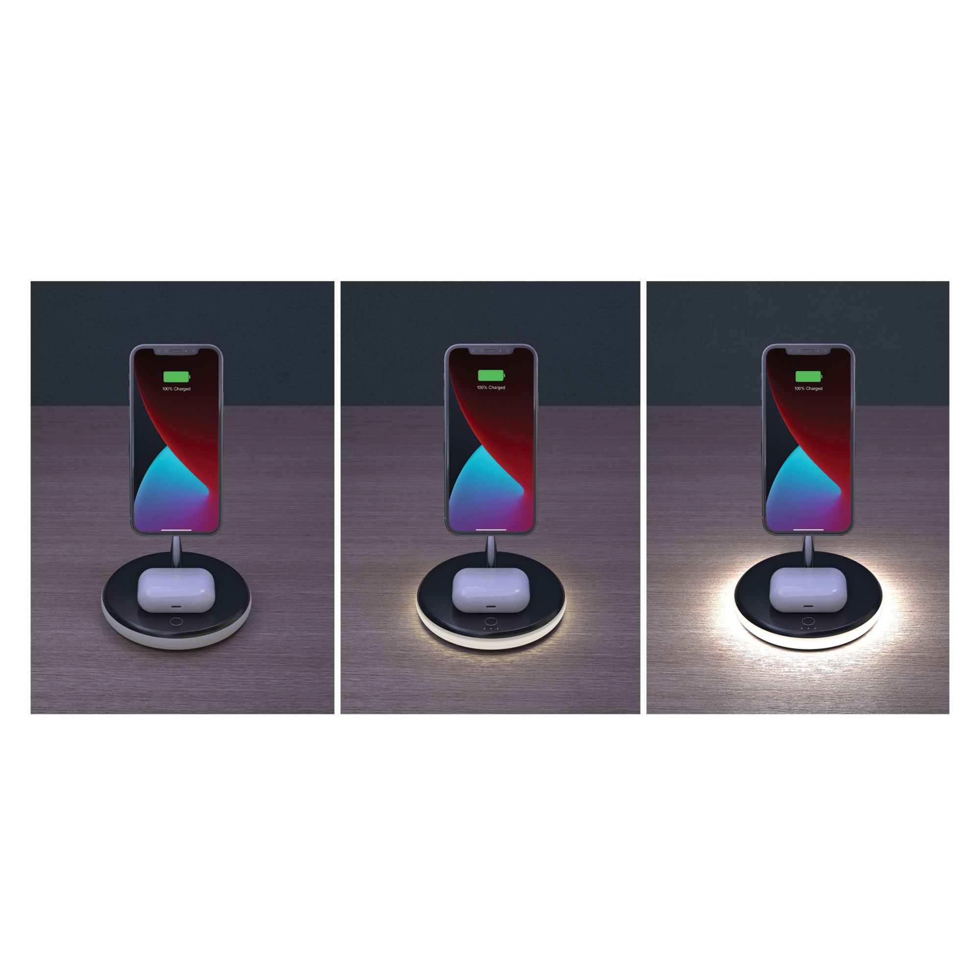Charge and display your iPhone, Apple Watch, Wireless AirPods, and any USB-enabled device simultaneously with the MagSafe Charge Station. This MagSafe Charge Station includes Qi technology to charge a compatible device quickly and wirelessly through electromagnetic induction. Night Light features create soft illumination through dimmable options for uninterrupted sleep. Choose from high or low light displays and enjoy waking up feeling fully recharged, just like your devices.