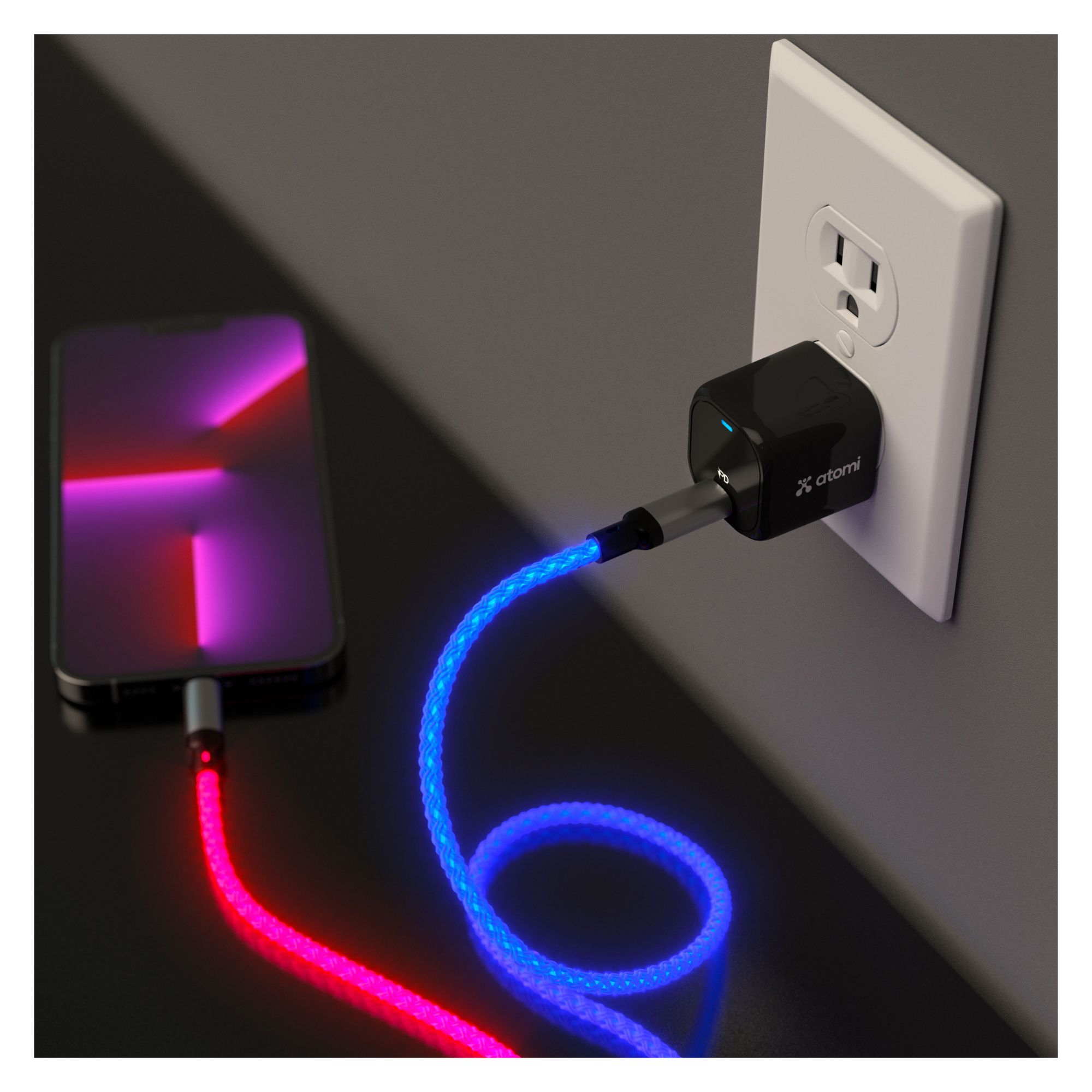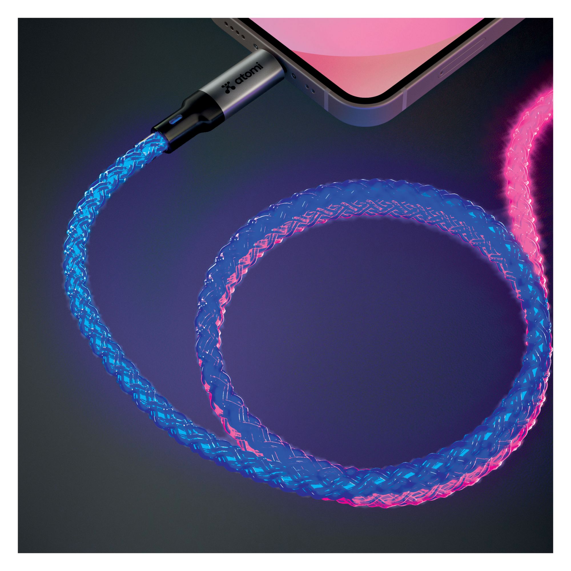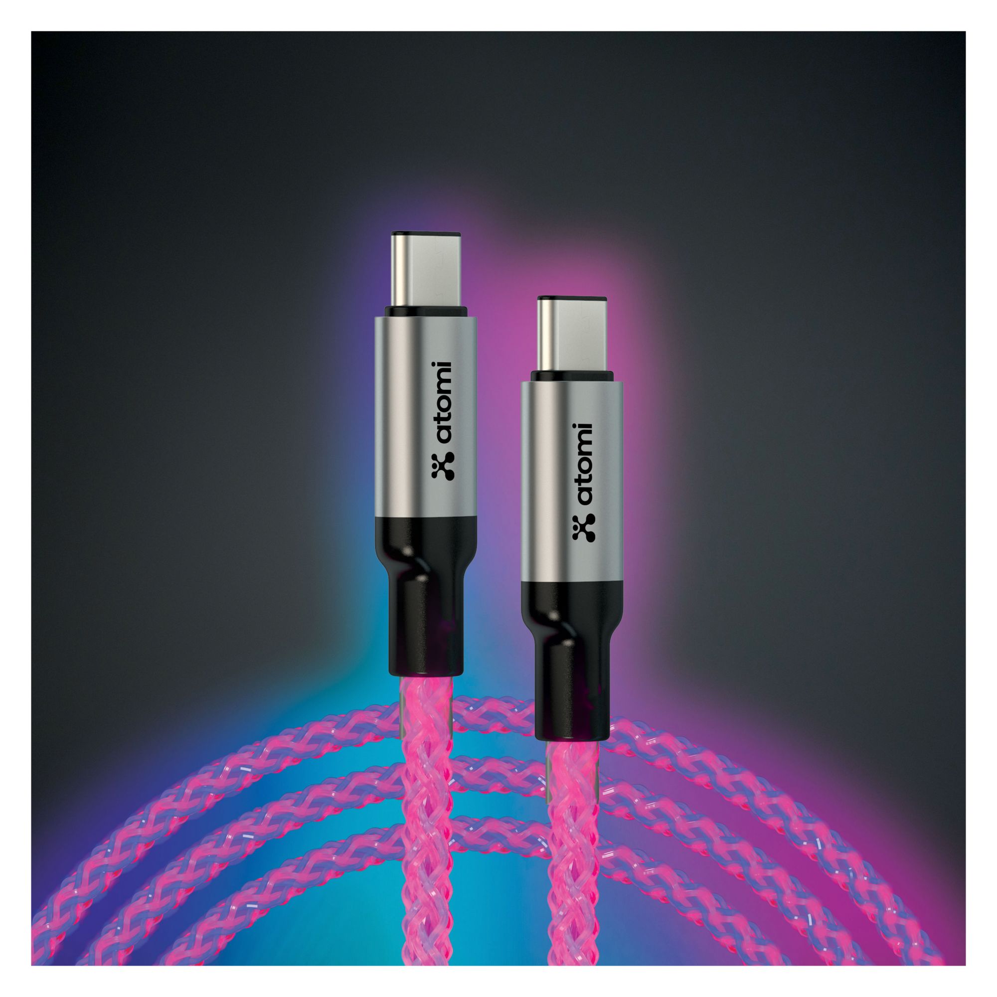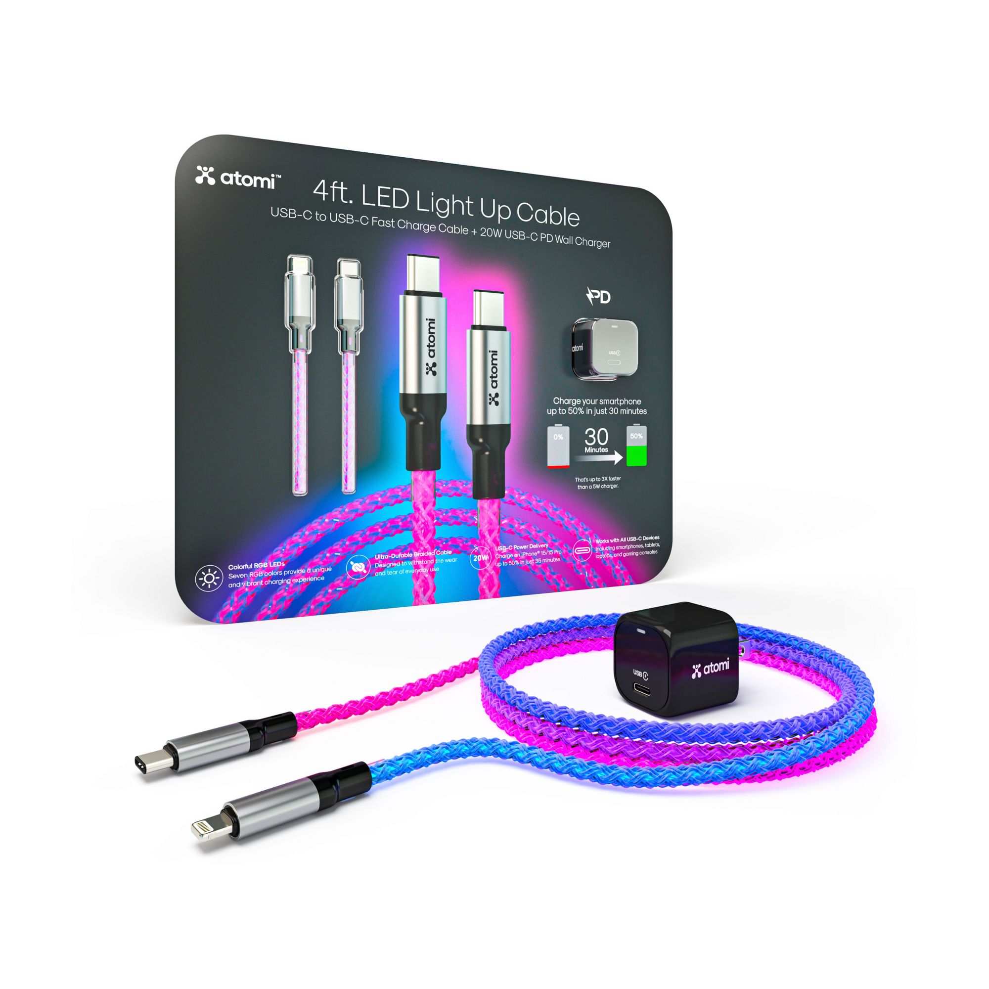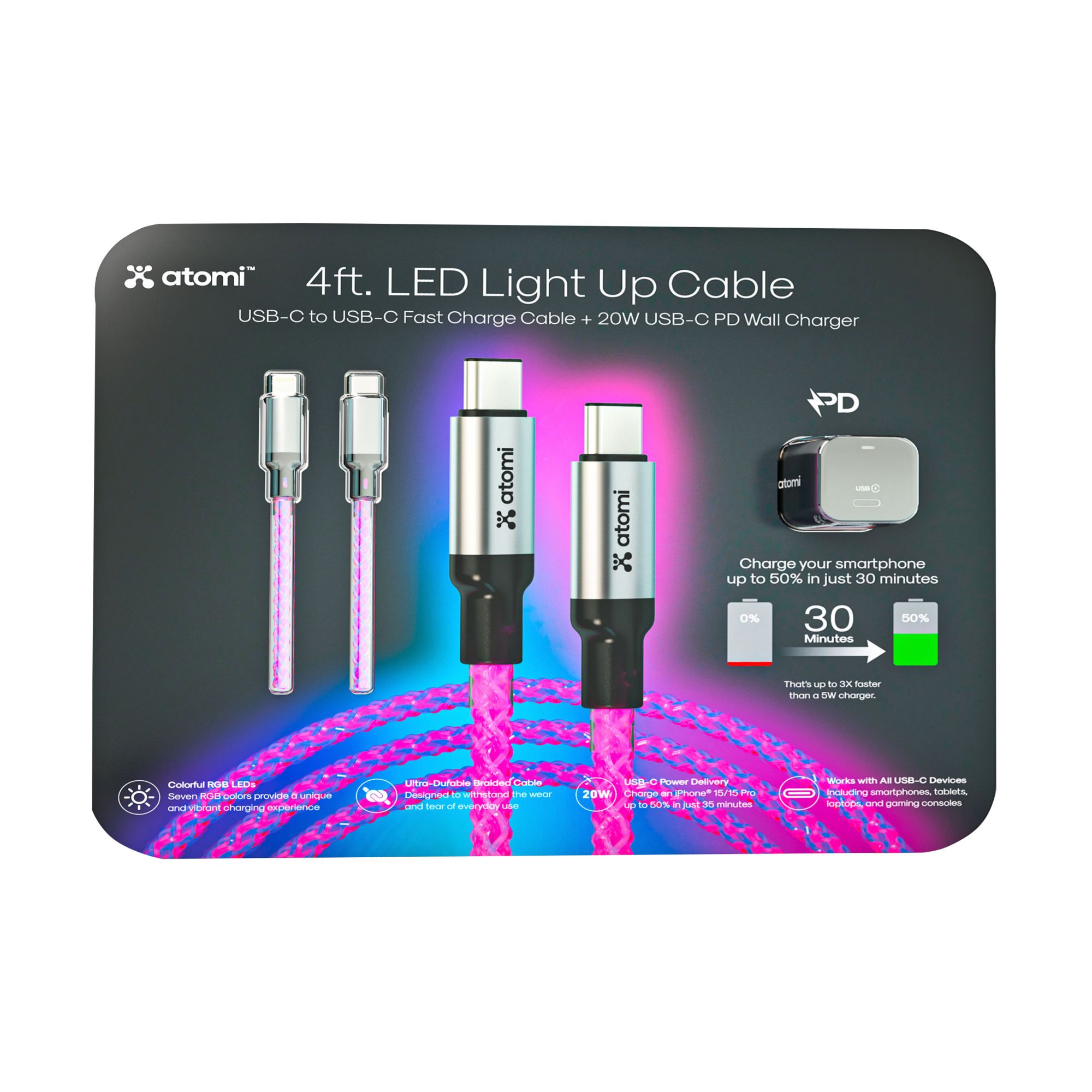 Atomi's 4’ LED light up cable delivers a fast and reliable 20W charging experience for all USB-C devices including smartphones, tablets, laptops, and gaming consoles. With a stylish and practical design, the braided cord can easily bend without breaking, ensuring its durability and longevity.