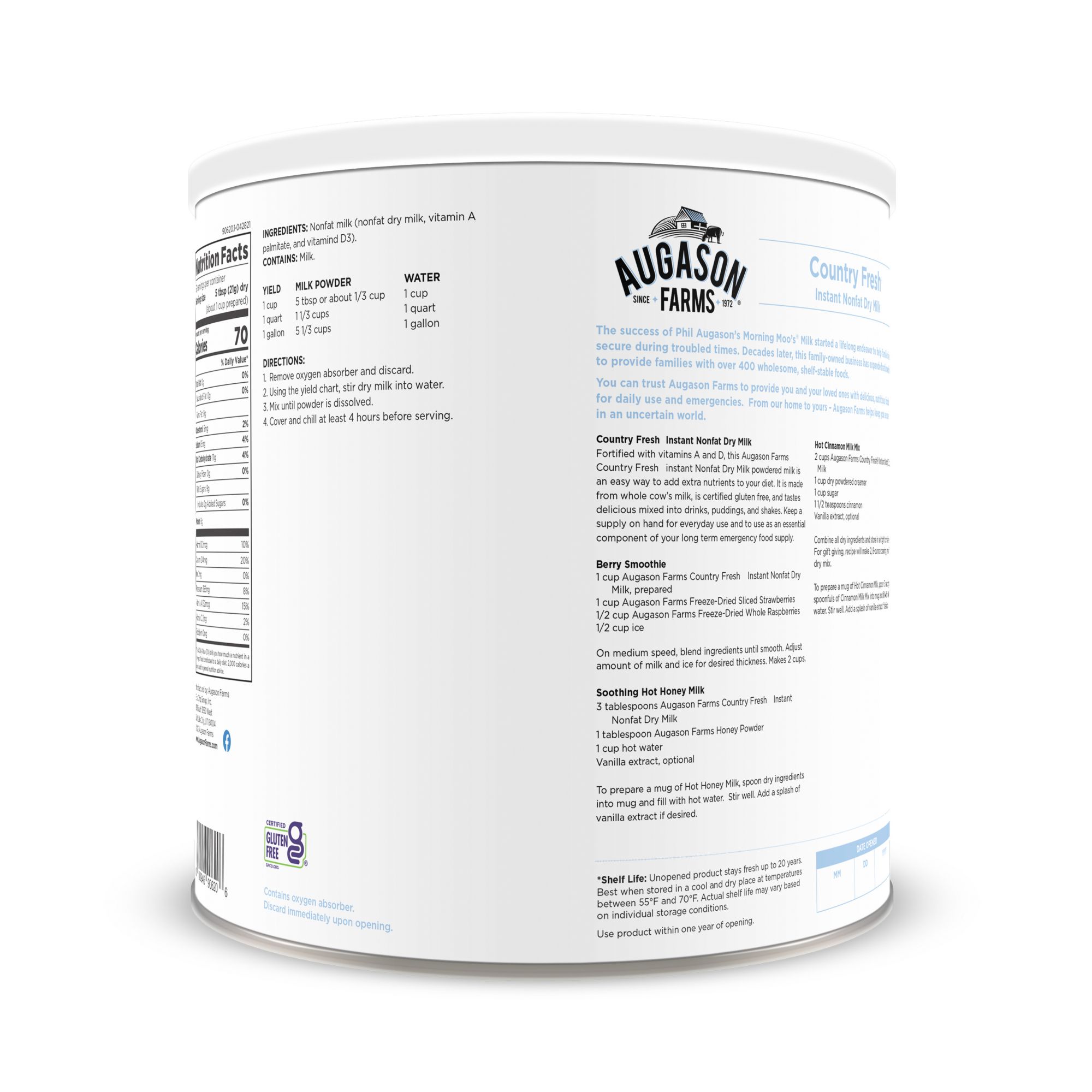 Fortified with vitamins A and D, Augason Farms Instant Nonfat Dry Milk is an easy way to add extra nutrients to your diet. Powdered milk is a must-have item to keep on your baking ingredients list and to add to your emergency food supply.