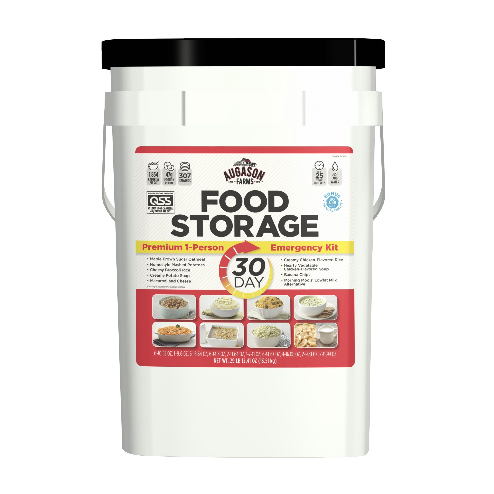 Augason Farms Emergency Food Supply 30-Day Pail is your survival food solution. Enough food is included in the pail for one person to consume an average of 1,822 calories per day for 30 days or a family of 4 for over a week. Augason Farms crafts their food for both every day and food storage use. You can rest assured that your family will love these tried-and-true recipes. Whether it's a hearty oatmeal breakfast or filling cheesy broccoli rice, these foods are easy to prepare and have home-cooked flavor. The included 30-day meal planner offers a wide range of appetizing combinations, making it easy to mix and match meals.
