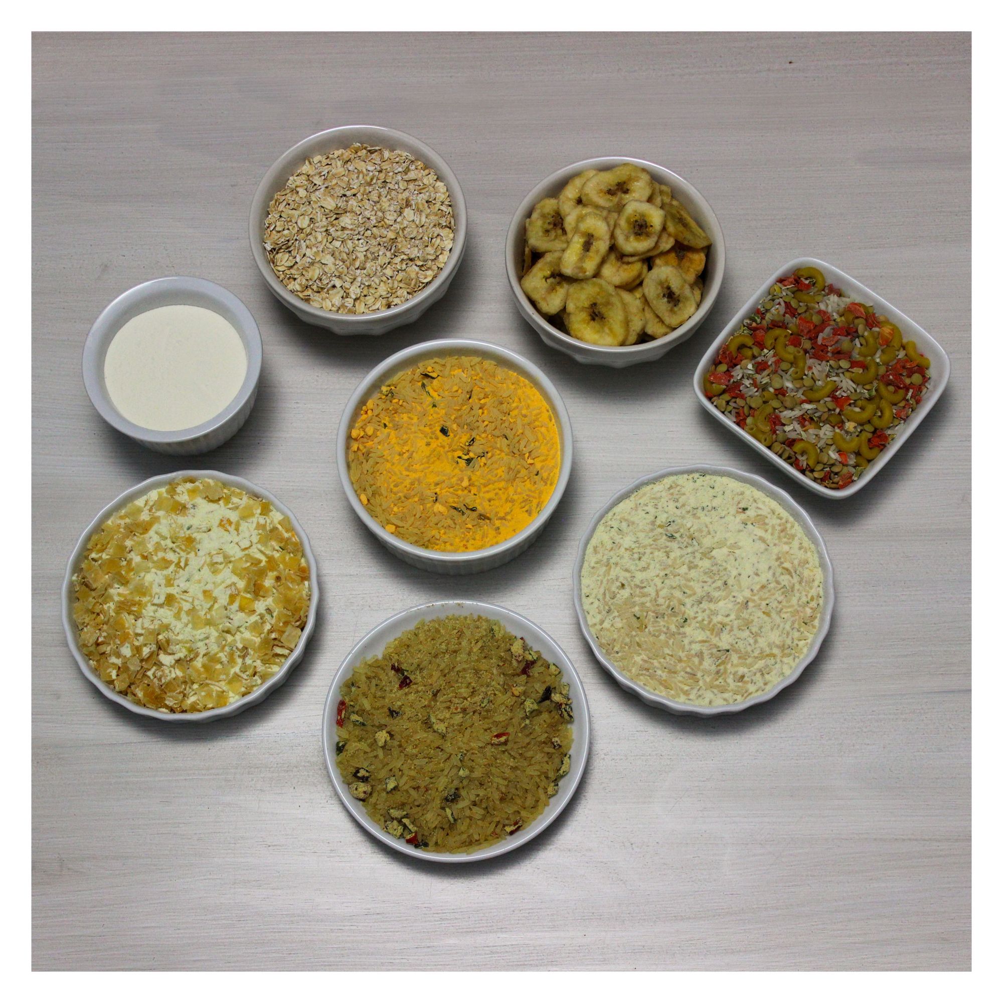 Includes maple brown sugar oatmeal, banana chips, creamy chicken rice, creamy potato soup, hearty vegetable chicken soup, cheesy broccoli rice, Spanish rice and Morning Moo's lowfat milk alternative