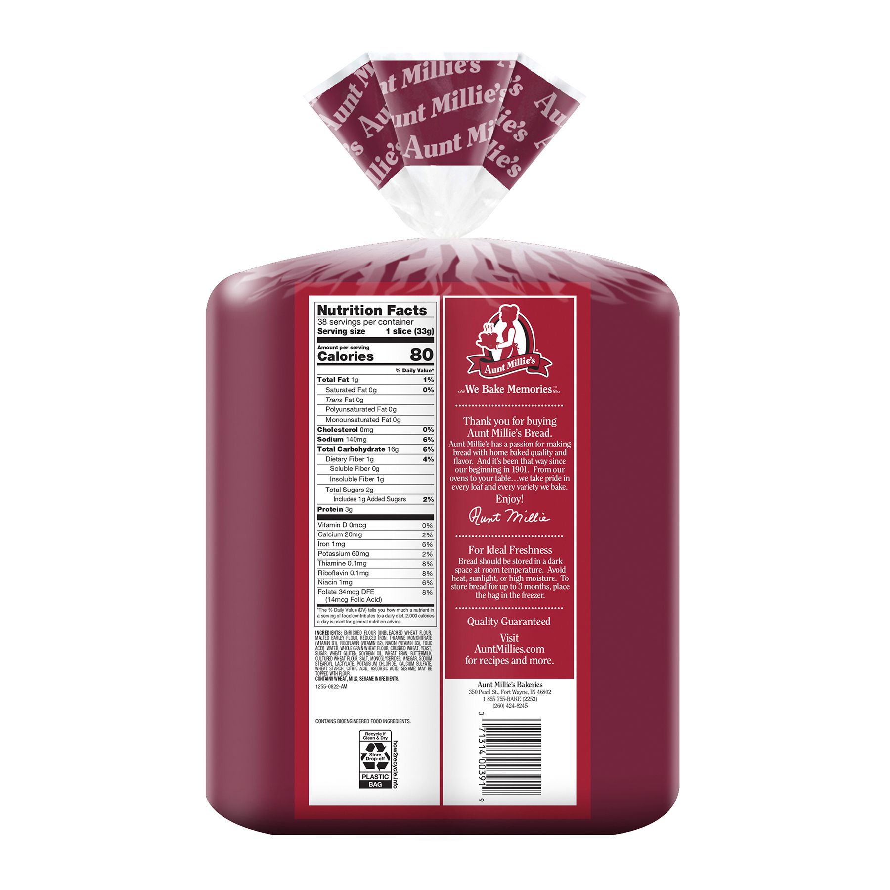Aunt Millie's Cracked Wheat with Whole Grain Bread is baked with whole grain and crushed wheat. A tasty alternative to white bread, this homestyle whole grain bread is hearty and full of soft, wholesome goodness. The rich flavor of cracked wheat and whole grain wheat flour makes every slice a great addition to a soup-and-sandwich combo. Baked by Aunt Millie's, a family-owned business since 1901.