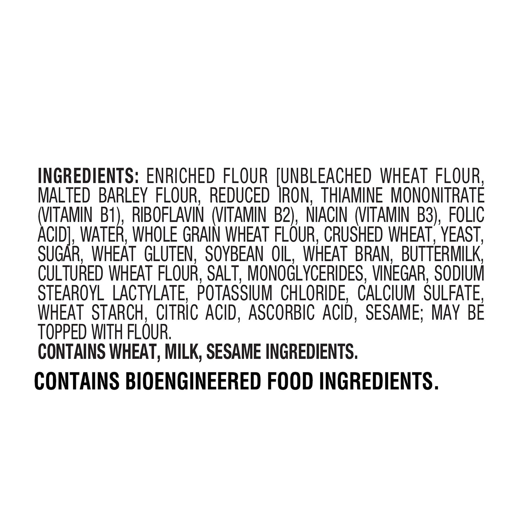 Ingredients Enriched Flour [Unbleached Wheat Flour, Malted Barley Flour, Reduced Iron, Thiamine Mononitrate (Vitamin B1), Riboflavin (Vitamin B2), Niacin (Vitamin B3), Folic Acid], Water, Whole Grain Wheat Flour, Crushed Wheat, Yeast, Sugar, Wheat Gluten, Soybean Oil, Wheat Bran, Buttermilk, Cultured Wheat Flour, Salt, Monoglycerides, Vinegar, Sodium Stearoyl Lactylate, Potassium Chloride, Calcium Sulfate, Wheat Starch, Citric Acid, Ascorbic Acid, Sesame; May Be Topped With Whole Grain Wheat Flour.
