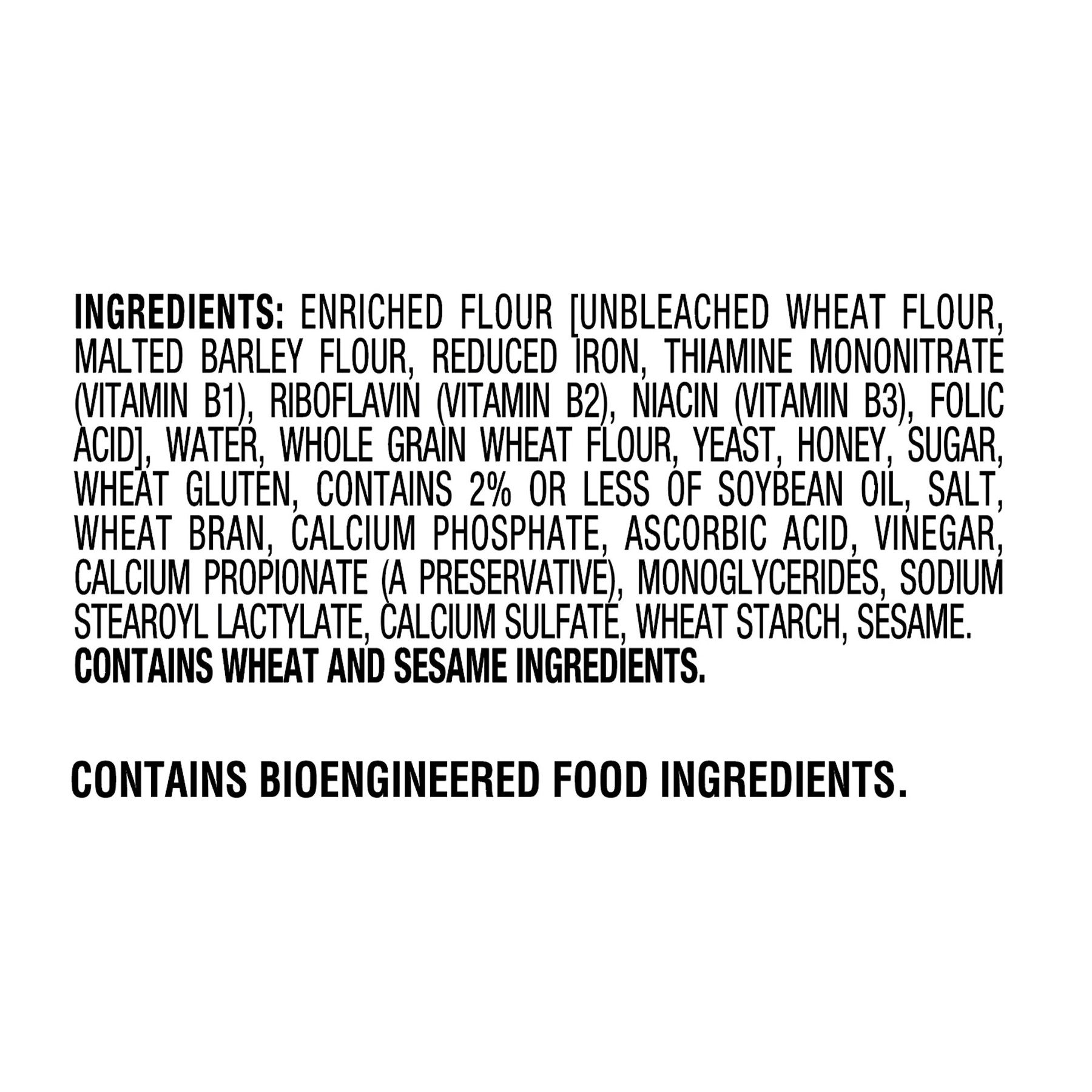 Ingredients: Enriched Flour [Unbleached Wheat Flour, Malted Barley Flour, Reduced Iron, Thiamine Mononitrate (Vitamin B1), Riboflavin (Vitamin B2), Niacin (Vitamin B3), Folic Acid], Water, Whole Grain Wheat Flour, Yeast, Honey, Sugar, Wheat Gluten, Contains 2% Or Less Of Soybean Oil, Salt, Wheat Bran, Calcium Phosphate, Ascorbic Acid, Vinegar, Calcium Propionate (A Preservative), Monoglycerides, Sodium Stearoyl Lactylate, Calcium Sulfate, Wheat Starch, Sesame.