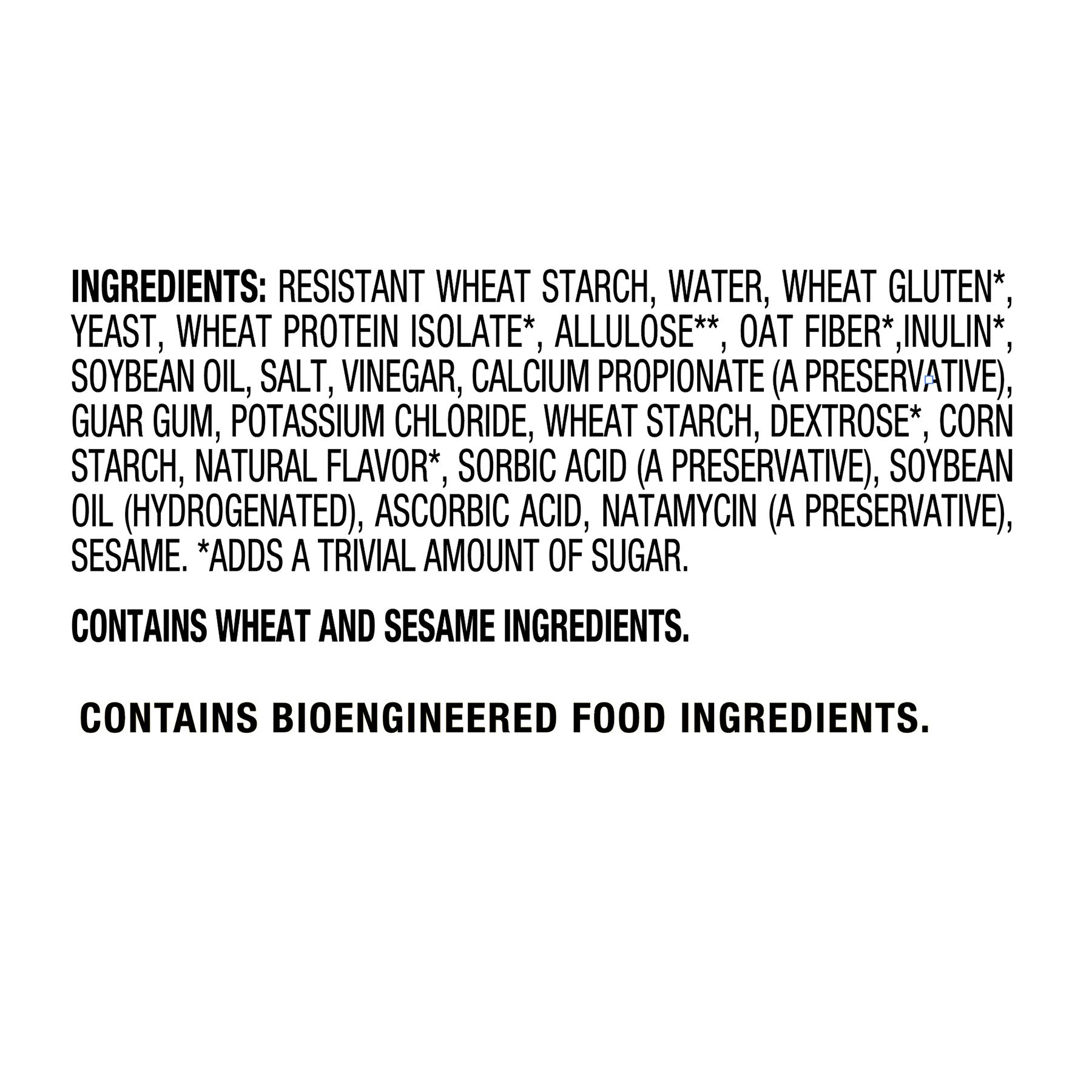 Ingredients Resistant Wheat Starch, Water, Wheat Gluten†, Yeast, Wheat Protein Isolate†, Allulose†, Oat Fiber†, Contains 2% Or Less Of Inulin†, Soybean Oil, Salt, Vinegar, Calcium Propionate (A Preservative), Guar Gum, Potassium Chloride, Wheat Starch, Dextrose†, Corn Starch, Natural Flavor†, Sorbic Acid (A Preservative), Soybean Oil (Hydrogenated), Ascorbic Acid, Natamycin (A Preservative), Sesame. †adds A Trivial Amount Of Sugar.