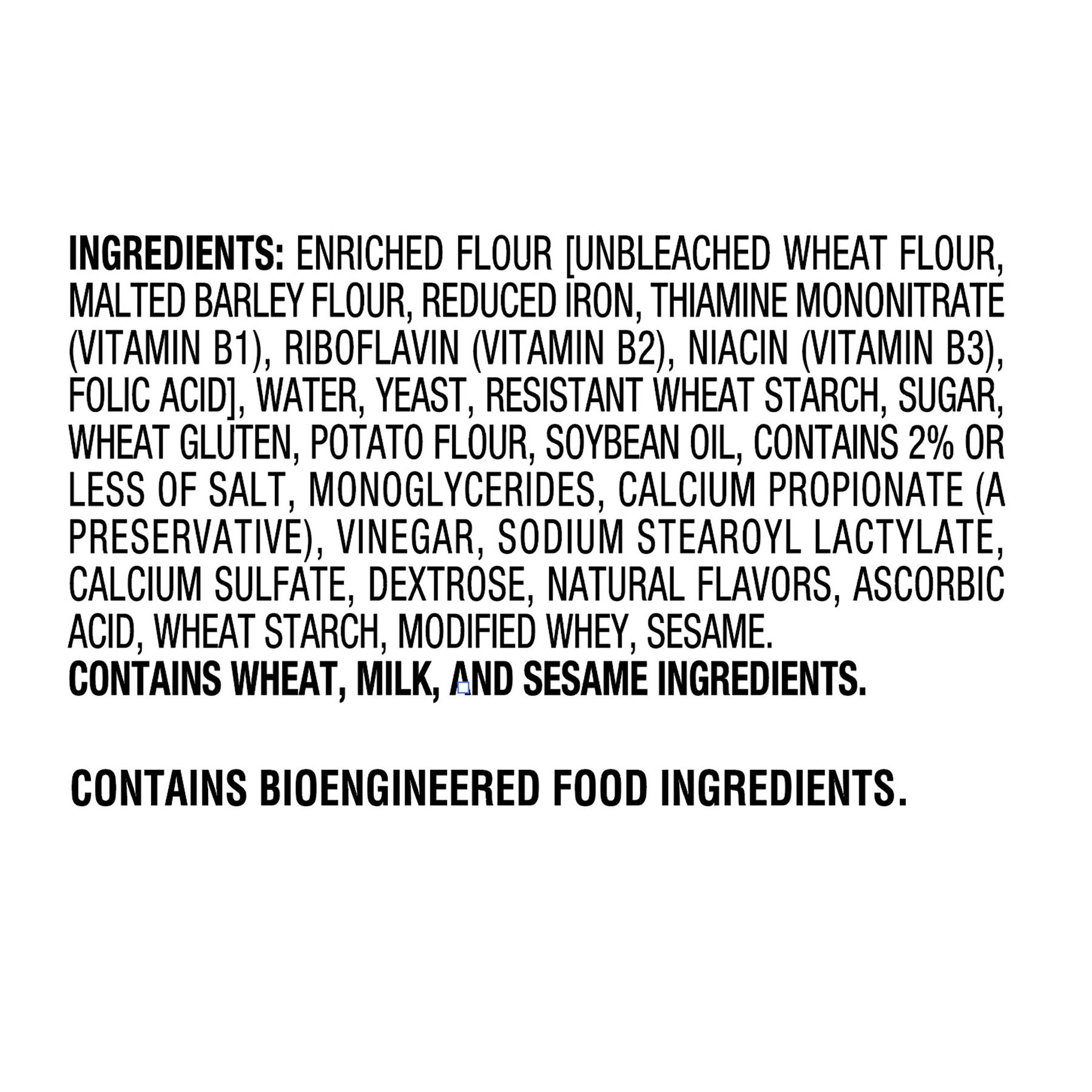 Ingredients: Enriched Flour [Unbleached Wheat Flour, Malted Barley Flour, Reduced Iron, Thiamine Mononitrate (Vitamin B1), Riboflavin (Vitamin B2), Niacin (Vitamin B3), Folic Acid], Water, Yeast, Resistant Wheat Starch, Sugar, Wheat Gluten, Potato Flour, Soybean Oil, Contains 2% Or Less Of Salt, Monoglycerides, Calcium Propionate (A Preservative), Vinegar, Sodium Stearoyl Lactylate, Calcium Sulfate, Dextrose, Natural Flavors, Ascorbic Acid, Wheat Starch, Modified Whey, Sesame.