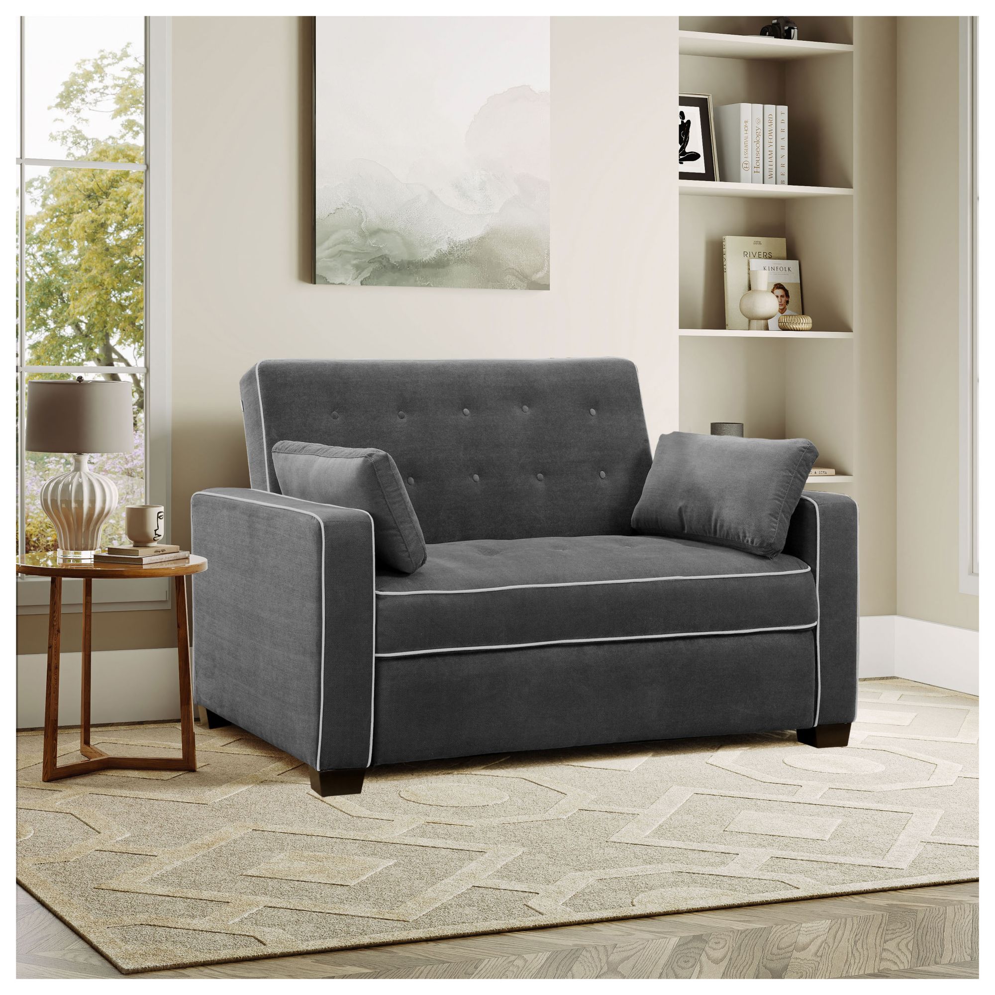 3 seat functions: sofa, lounger and bed Full-size sleeper with pull-out bed Serta Dream Coils® 2 matching pillows provided Fully upholstered side panels Includes one convertible sofa