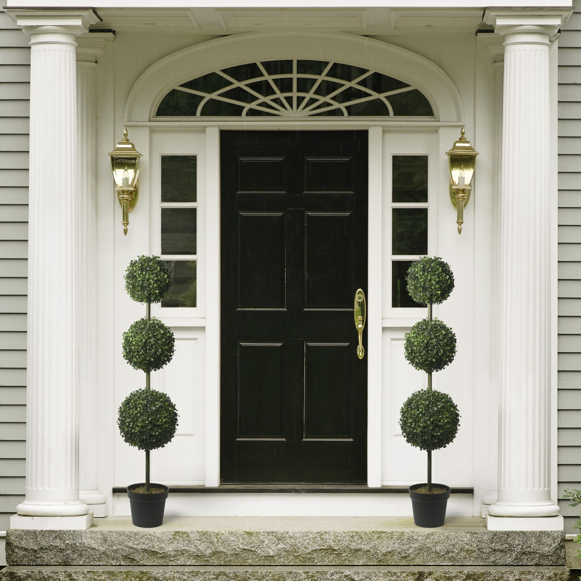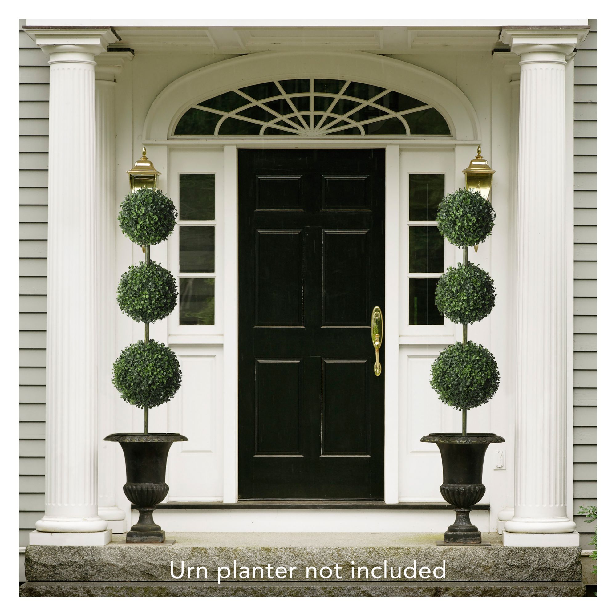 Add some life to your space with this pair of hassle-free boxwood triple ball faux topiary trees. The realistically molded leaves are made of a grade of UV-resistant polyethylene which allows you to put them wherever you like whether it is outdoors, indoor, or in hot or cold weather. The plant is anchored by a weighted plastic pot that makes it stand firmly on the ground.