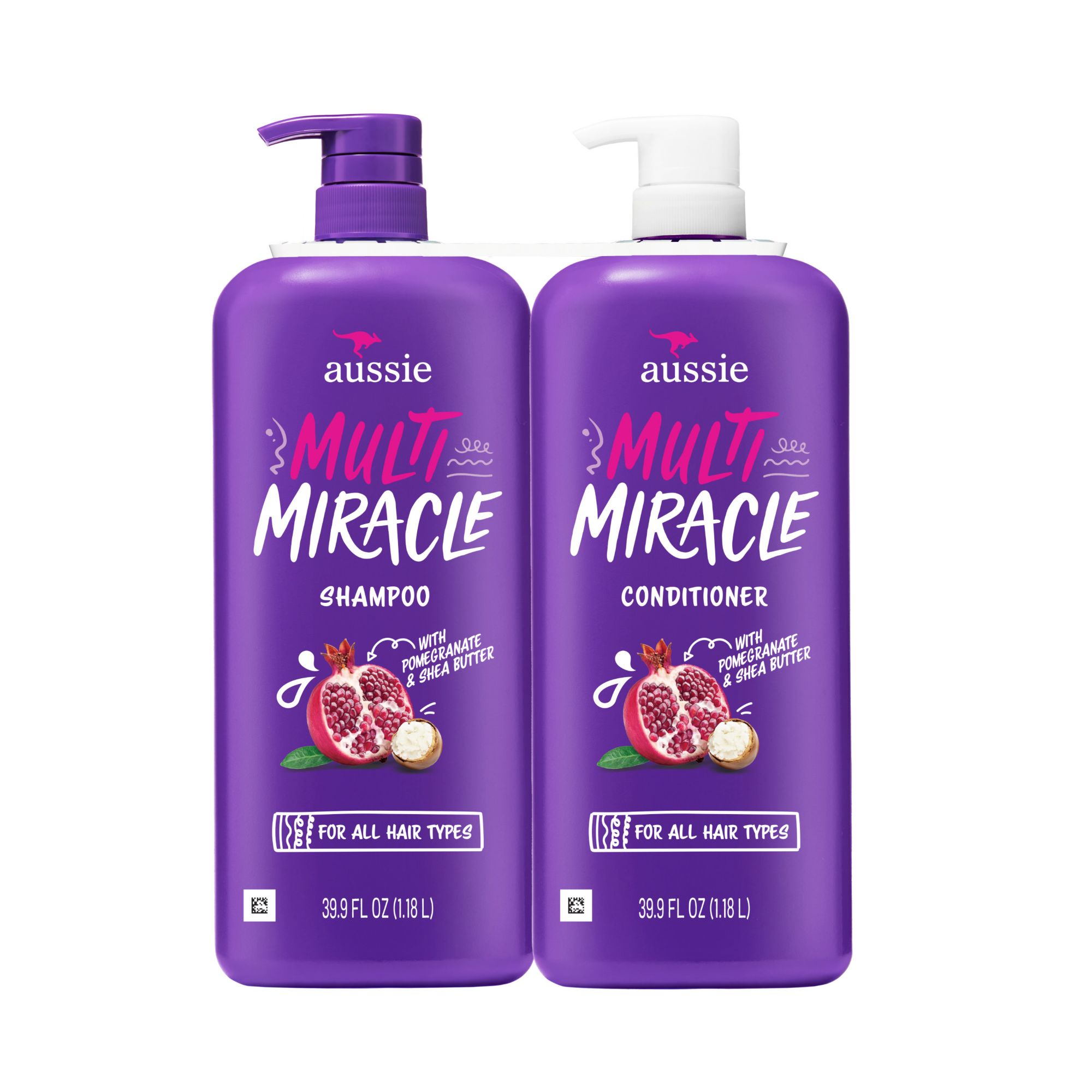 Why settle for less when you can have it all? Discover the power of Aussie Multi Miracle. This moisturizing shampoo and conditioner are 3-in-1 miracles designed to tackle multiple hair concerns in one simple routine. Whether your hair is dry, damaged, frizzy, or just in need of a refresh, this Multi-Miracle formula helps deliver noticeable softness, shine, and manageability. This duo, infused with shea butter and pomegranate, is paraben and cruelty free, making it ideal for all hair textures. This dynamic pair works together to cleanse, condition, and revive your hair from root to tip. The shampoo provides a rich lather that gently removes buildup while locking in essential moisture, leaving your hair refreshed and shiny. The conditioner smooths and detangles, helping to reduce breakage and leaving your strands silky and curls defined. How to use: Apply a generous amount of the Multi-Miracle Shampoo to wet hair, enjoy the refreshing fragrance, massage into the scalp and hair to create a rich lather, then rinse thoroughly. Follow with the Multi-Miracle Conditioner, combing it through from mid-length to ends. Leave it on for 2-3 minutes to allow the nourishing ingredients to penetrate, then rinse well. Use regularly for best results and hair that looks and feels truly transformed.