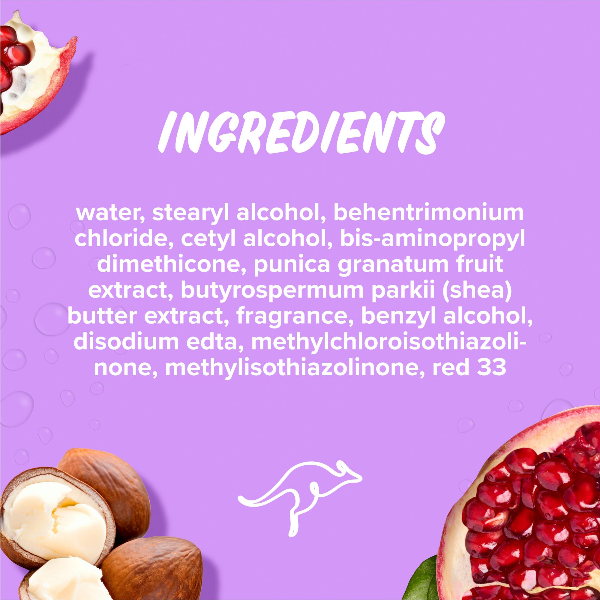 Water, Sodium Lauryl Sulfate, Cocamidopropyl Betaine, Sodium Chloride, Punica Granatum Fruit Extract, Butyrospermum Parkii (Shea) Butter Extract, Fragrance, Dimethicone, Sodium Citrate, Sodium Xylenesulfonate, Dimethiconol, Glycol Distearate, Sodium Benzoate, TEA-Dodecylbenzenesulfonate, Citric Acid, Guar Hydroxypropyltrimonium Chloride, Tetrasodium EDTA, Trideceth-10, Polyquaternium-6, Trihydroxystearin, Hydrochloric Acid, Benzyl Alcohol, Methylchloroisothiazolinone, Methylisothiazolinone. Water, Stearyl Alcohol, Behentrimonium Chloride, Cetyl Alcohol, Bis-Aminopropyl Dimethicone, Punica Granatum Fruit Extract, Butyrospermum Parkii (Shea) Butter Extract, Fragrance, Benzyl Alcohol, Disodium EDTA, Methylchloroisothiazolinone, Methylisothiazolinone, Red 33.