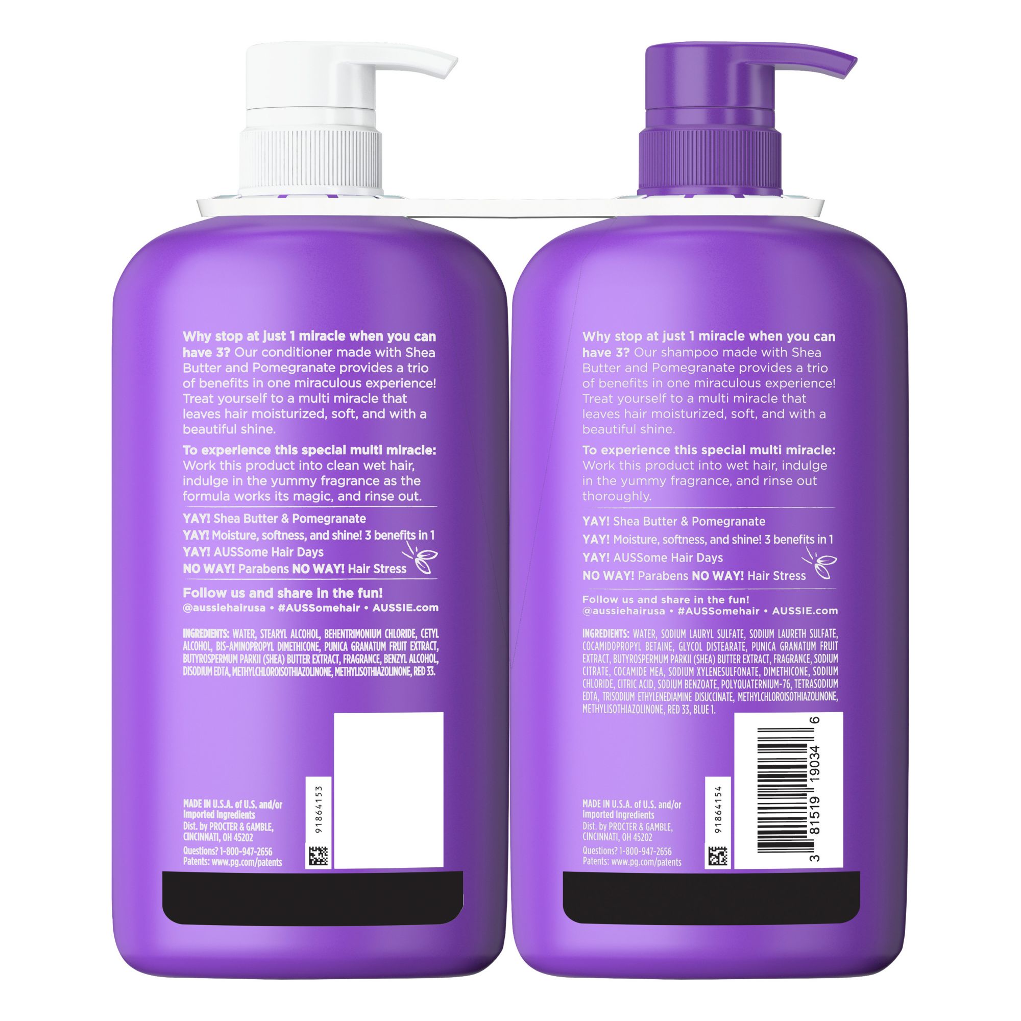 Who says you can't have it all? Pick up the Aussie Multi Miracle Shampoo and Conditioner bundle and give your hair everything it's ever wanted. This moisturizing shampoo and conditioner are 3-in-1 miracles. Both items are made to do more and are specially formulated to leave your hair softer, smoother, and more hydrated. To use this Aussie Multi Miracle Shampoo, work the product into wet hair, indulge in the yummy fragrance, and rinse out thoroughly. The multi-benefit shampoo will leave your hair shiny and stunning. To use this Aussie Multi Miracle Conditioner, work the product into clean wet hair, indulge in the yummy fragrance as the formula works its magic, and rinse out. The multi-benefit conditioner moisturizes for touchably soft hair and defined curls. Crafted with shea butter and pomegranate, this Aussie Multi Miracle Shampoo and Conditioner bundle gives your hair miraculous moisture without weighing it down. Plus, the fresh, fruity pomegranate scent will revive your senses. This is a hair care regimen you'll want to share with every beauty lover you know. Aussie is proud to be a PETA certified cruelty-free brand and their products are never tested on animals. Even better, this shampoo and conditioner bundle for shinier hair is paraben-free.