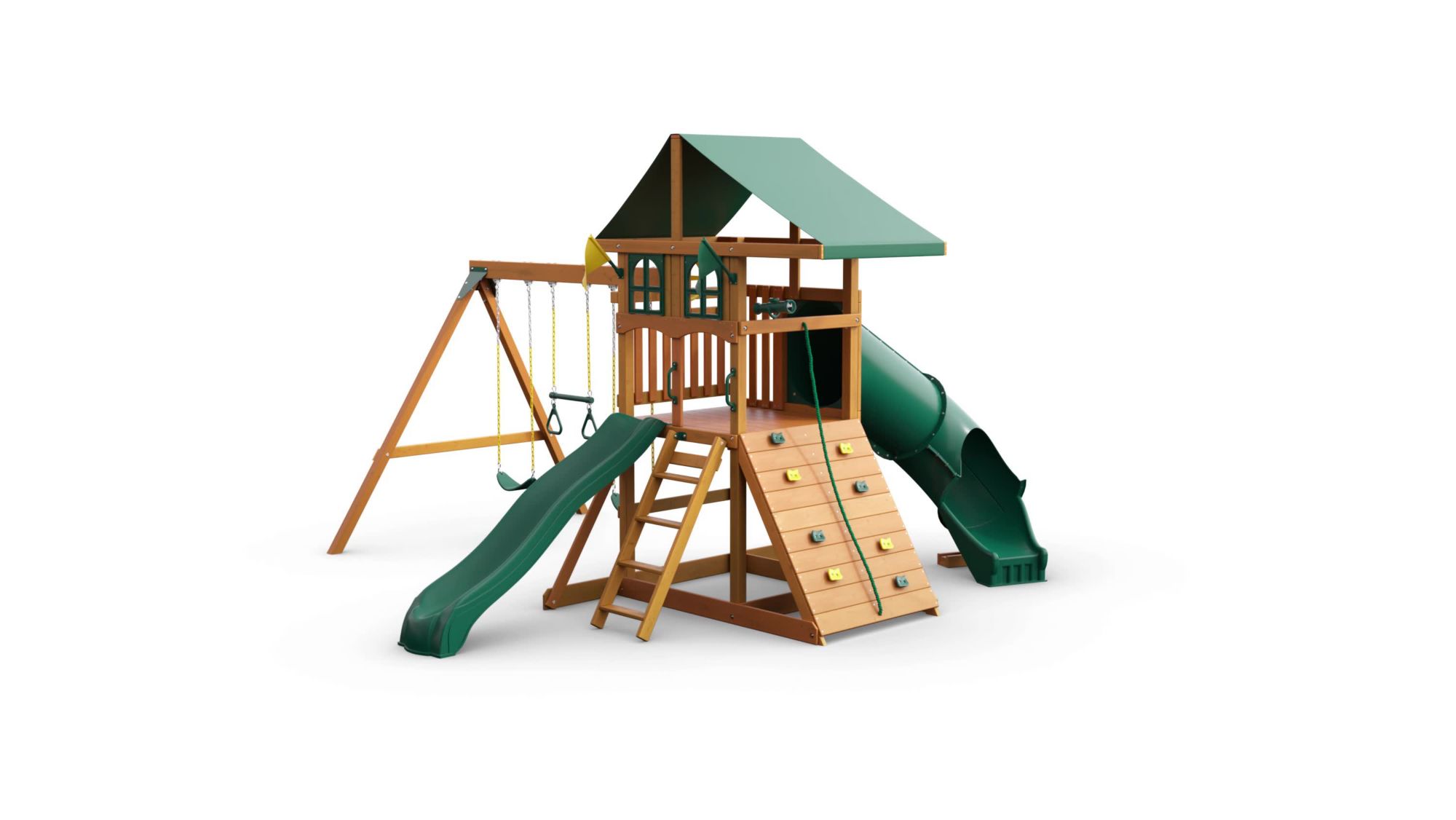 - Upper deck includes window kit add-on which partially encloses the front of the deck and features two decorative windows adding an appealing homestyle design to the swing set