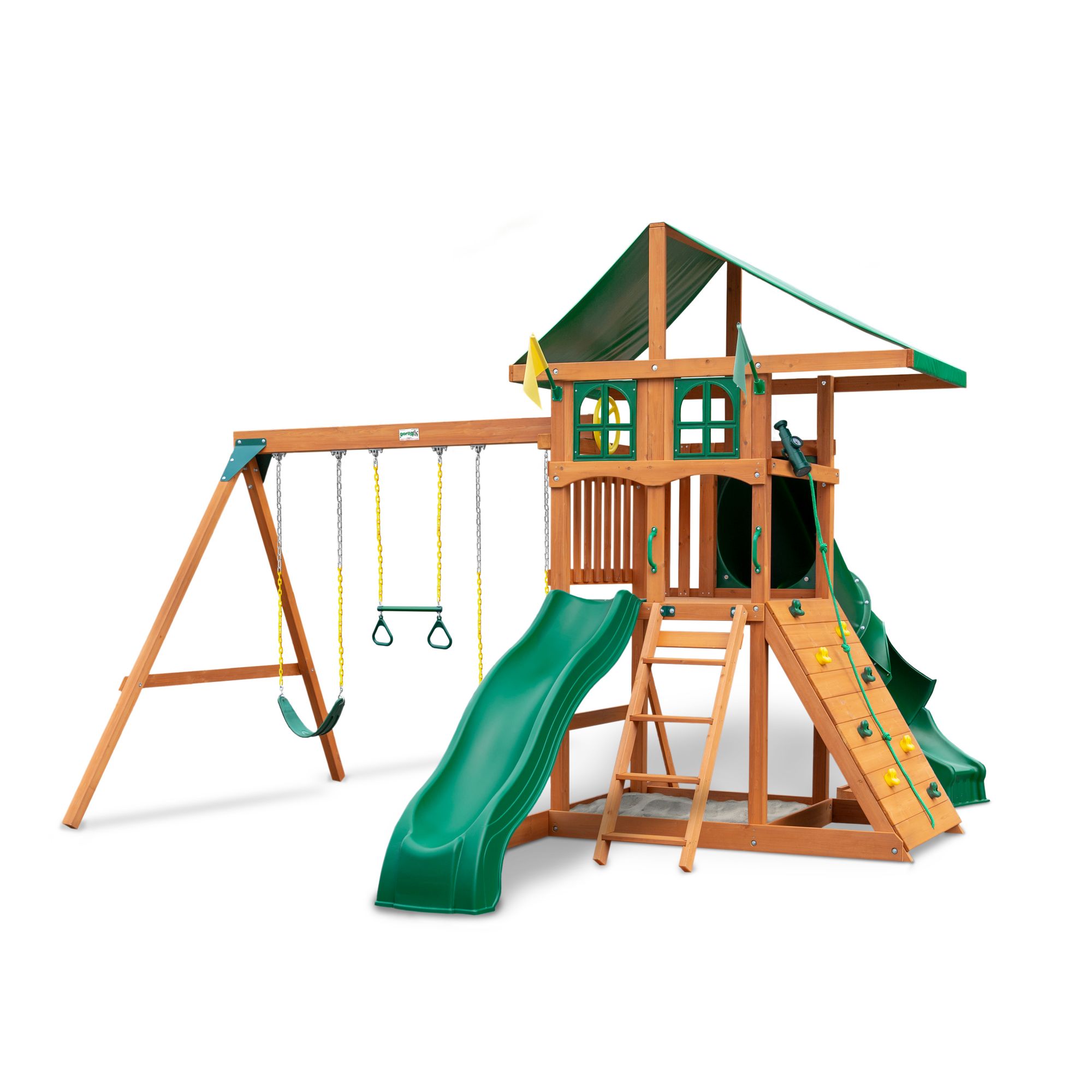 Children will never tire of the Gorilla Playsets Avalon Treehouse Swing Set. This playset features two slides, the Alpine Wave Slide and the Twister Tube Slide. Other fun-filled activities include the rock wall, the built-in sandbox area, two swing belts, and much more. The heavy-duty vinyl canopy with the window add-on protects the play deck and provides shade.