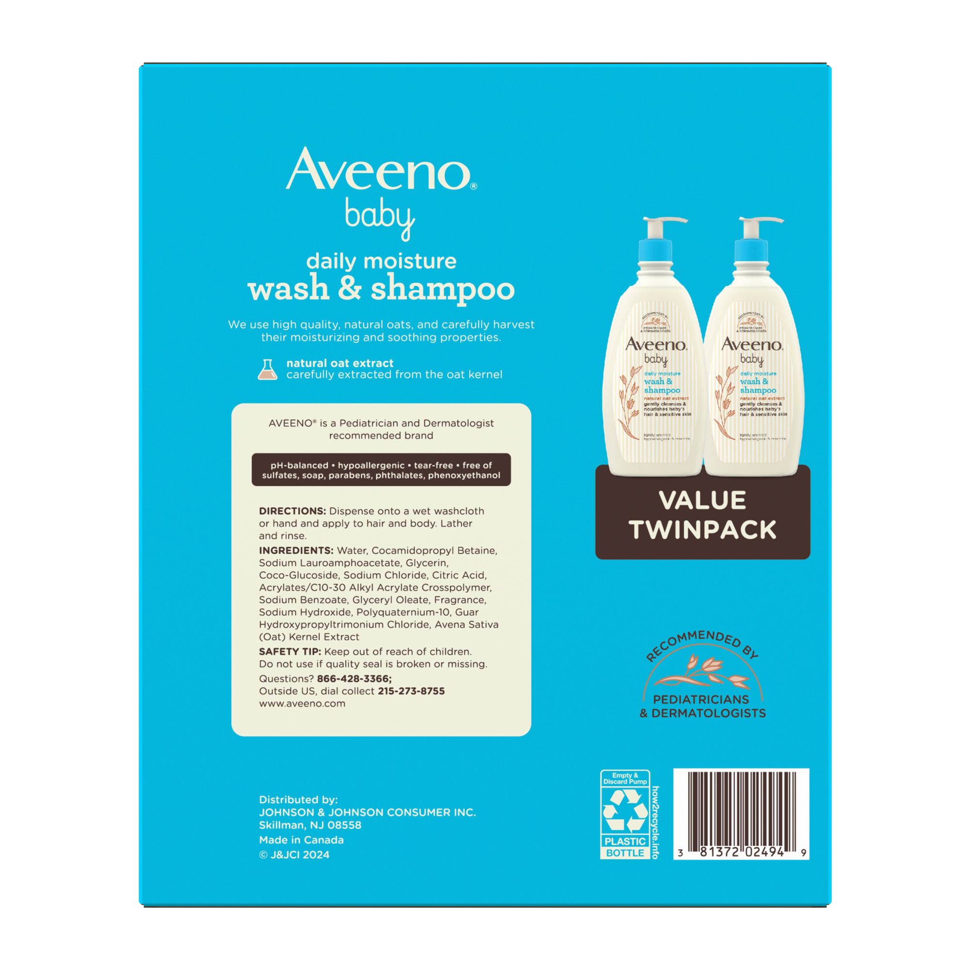 Cleanses baby's delicate hair and skin Nourishing tear-free shampoo and body wash formula gently cleanses without drying Includes natural oat extract which is known to soothe and gently nourish delicate skin Rich lathering formula rinses clean and leaves a light, fresh fragrance Recommended everyday use to keep baby's sensitive skin & hair feeling soft and smooth Sulfate-free, soap-free, hypoallergenic, paraben-, phthalate- and tear-free Pediatrician recommended brand Includes Aveeno Baby Daily Moisture Body Wash & Shampoo with Natural Oat Extract, 2 pk./18 fl. oz.