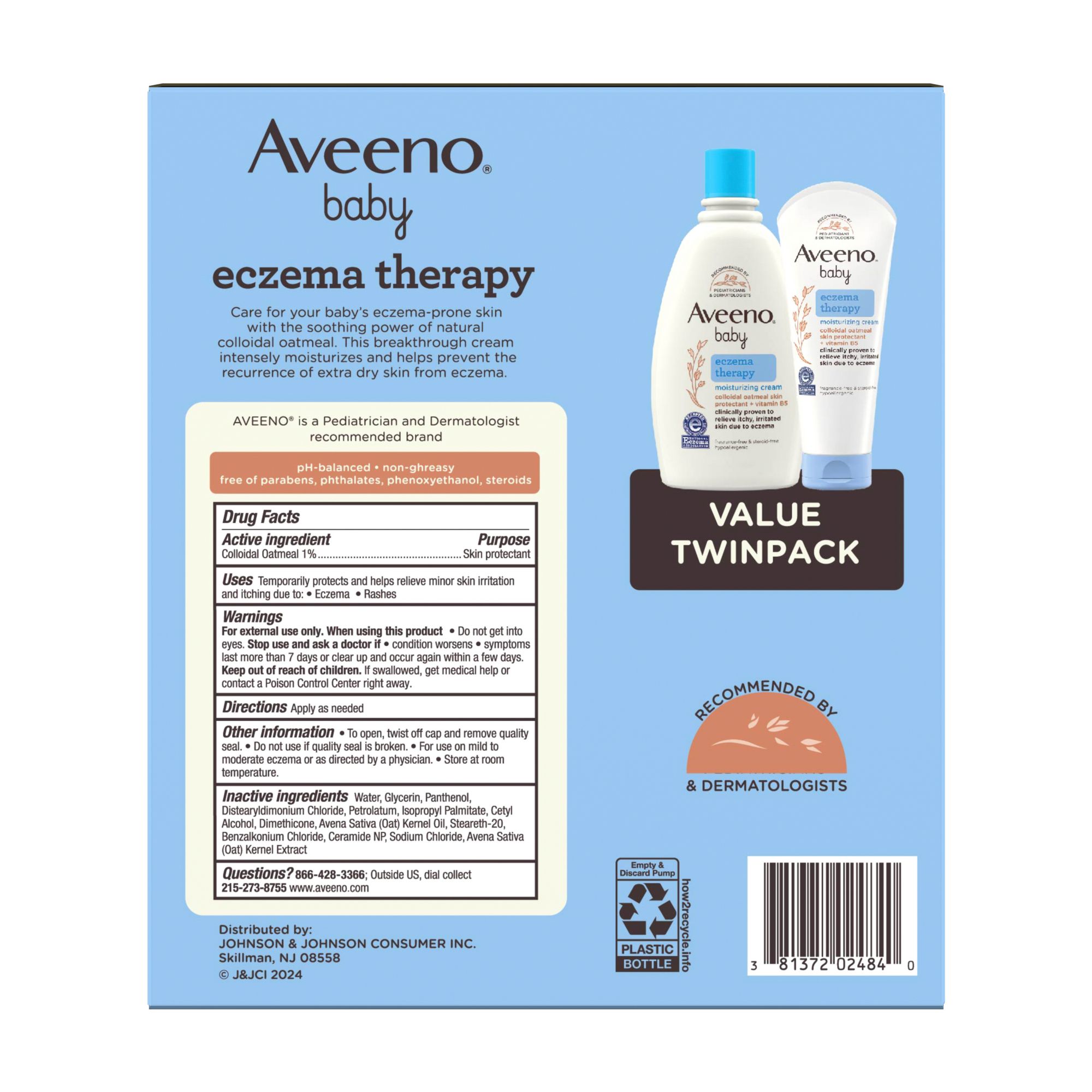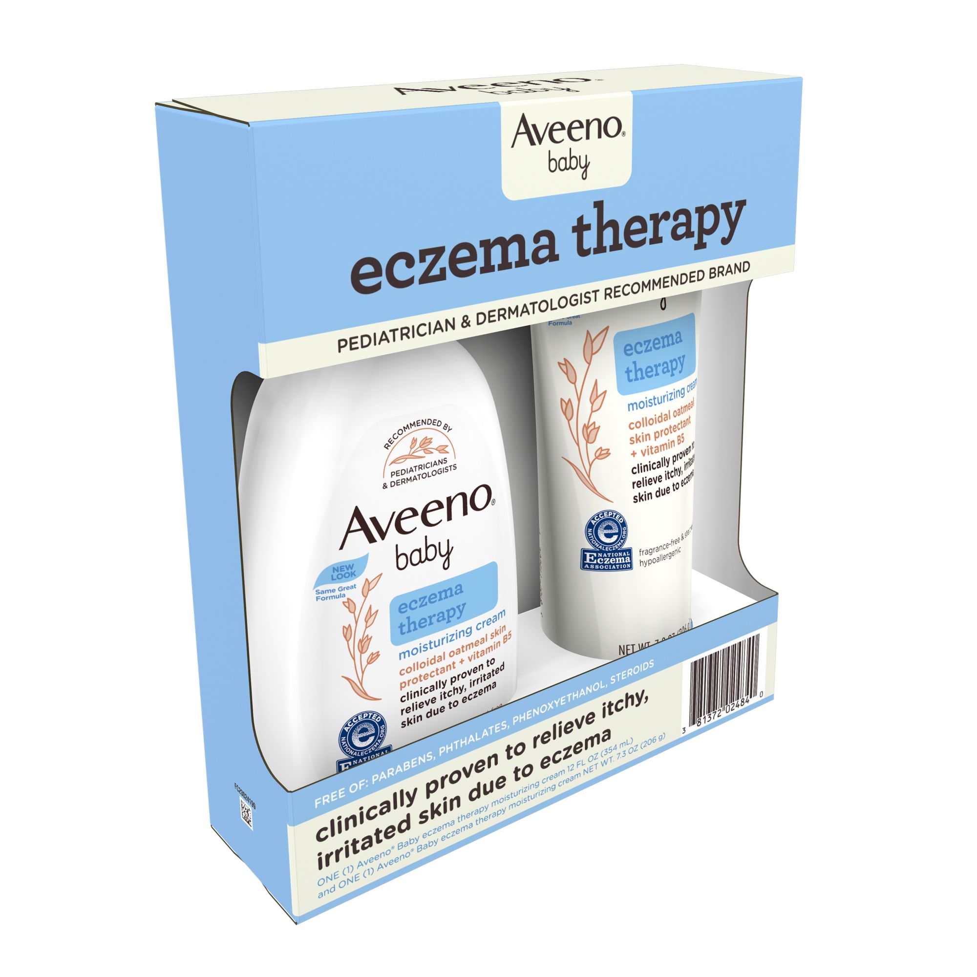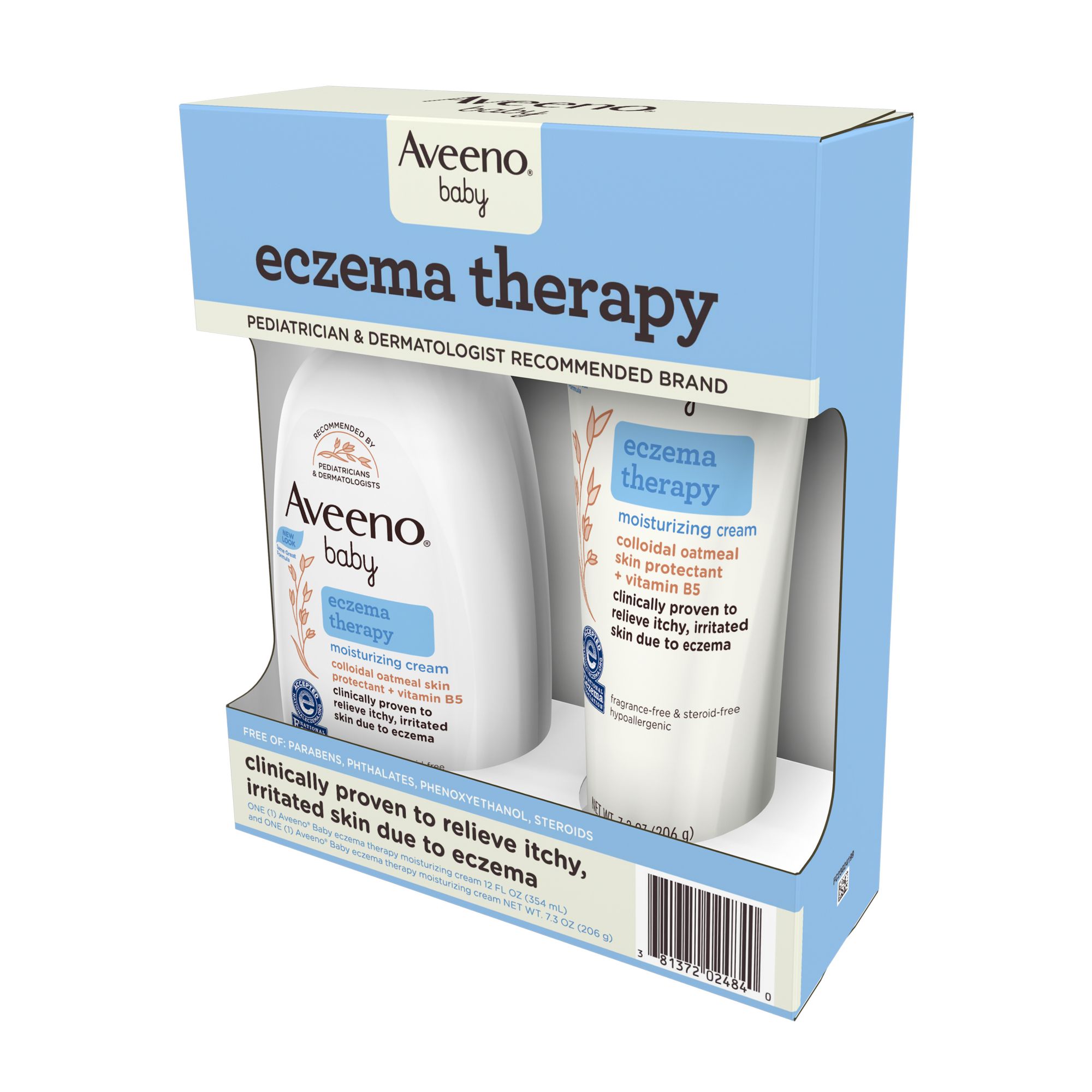 Aveeno Baby Eczema Therapy Moisturizing Body Cream helps relieve dry, itchy, irritated skin due to eczema. Developed with leading dermatologists, this hypoallergenic baby eczema cream uses the soothing power of natural colloidal oatmeal to help strengthen the skin's moisture barrier for prevention and protection against dryness. Formulated specially for babies, this non-greasy baby cream is clinically proven to relieve itchy, irritated skin due to eczema and intensely moisturizes skin to prevent the recurrence of extra dry skin from eczema. The unique formula, made with Natural Colloidal Oatmeal skin protectant and vitamin B5, is pH-balanced and free from steroids, fragrances, parabens, phthalates and phenoxyethanol. Aveeno is recommended by pediatricians and dermatologists and this baby eczema cream is accepted by the National Eczema Association.