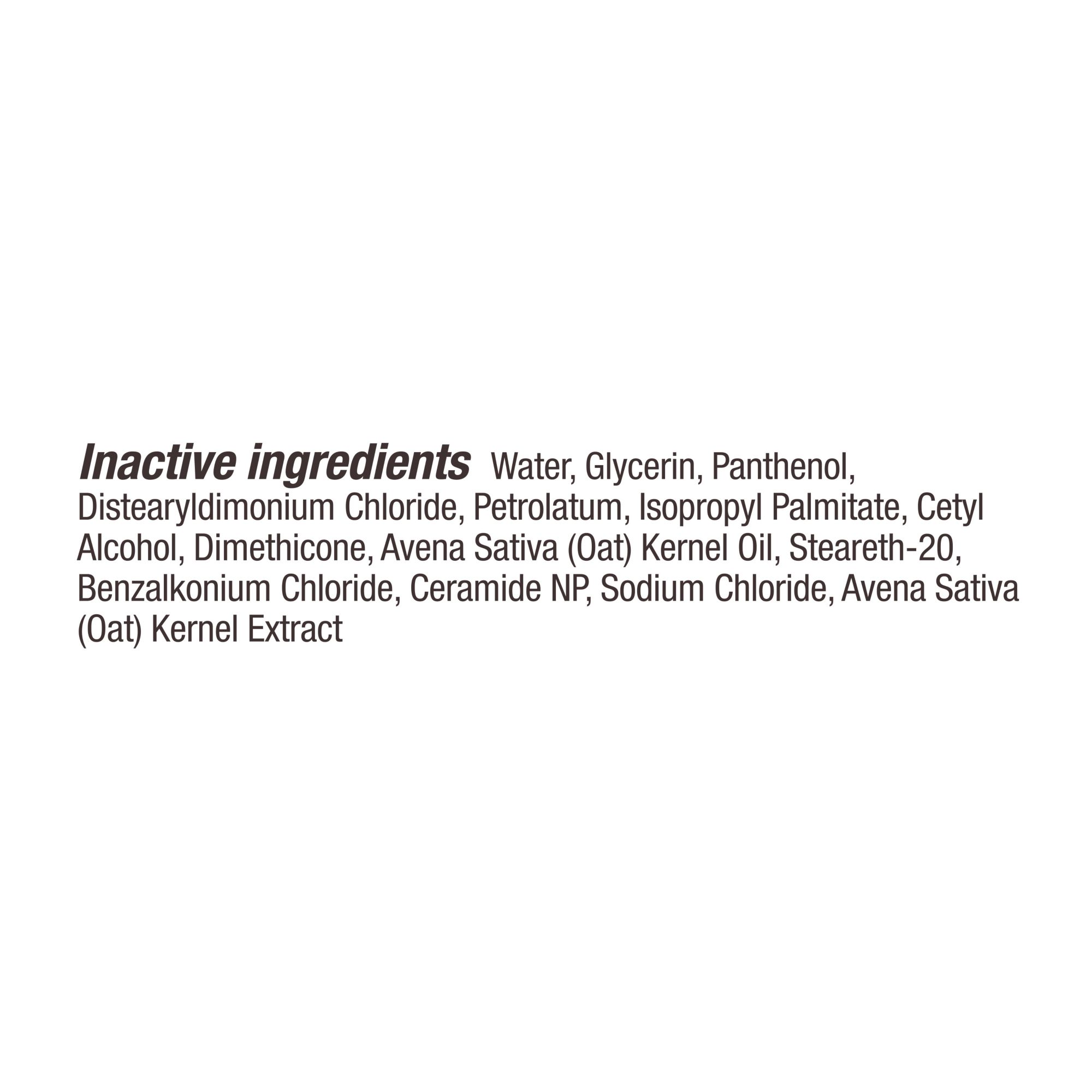Ingredients: Water, glycerin, panthenol, distearyldimonium chloride, petrolatum, isopropyl palmitate, cetyl alcohol, dimethicone, avena sativa (oat) kernel oil, steareth-20, benzalkonium chloride, ceramide NP, sodium chloride, avena sativa (oat) kernel extract