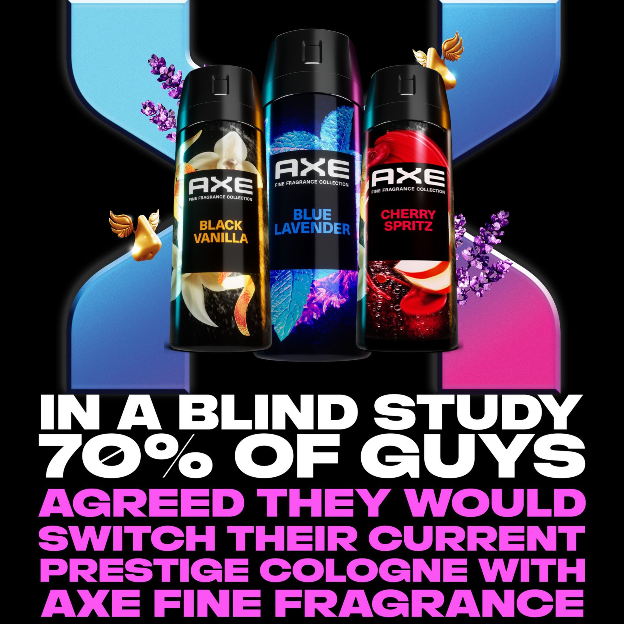 Smell finer than fine fragrances with the new AXE Fine Fragrance Collection. In a blind study, 70% of guys said they’d replace their fine fragrances with their favorite scent from the AXE Fine Fragrance Collection. Surprised? AXE is not. Their world-renowned perfumers have crafted these premium body sprays with indulgent, delicious fragrances infused with essential oils. Everyone deserves a hype man, so they made one in fragrance form. In just a few spritzes, you’ll get freshness and unbeatable confidence. Find your new favorite with this Scent Exploration Kit that includes three Fine Fragrance body sprays. AXE Black Vanilla Premium Body Spray with Orange + Sandalwood has an addictively delicious fragrance infused with orange essential oil. AXE Cherry Spritz Premium Body Spray with Red Apple + Amber has an indulgent, creamy fragrance infused with eucalyptus essential oil. AXE Blue Lavender Premium Body Spray with Mint + Amber has an exhilarating fresh fragrance infused with amber essential oil. AXE Fine Fragrance premium body sprays are formulated with 2x zinc zap technology (compared to other AXE body sprays), neutralizing odor and keeping you smelling fresh for 72 hours. Yep - that’s right. AXE is out here working smarter, not harder. This body spray is formulated with an aluminum-free formula that hits different, is easy on the skin, tough on odor, and is instantly refreshing. They know, they know - they really thought of everything. That's the AXE effect. IYK, YK. How to use: Apply your favorite AXE deodorant to your underarms in the morning, and touch up with AXE Fine Fragrance body spray as needed throughout the day. Twist the top to reveal the nozzle. Hold the can six inches from your body and spray to neck and chest.