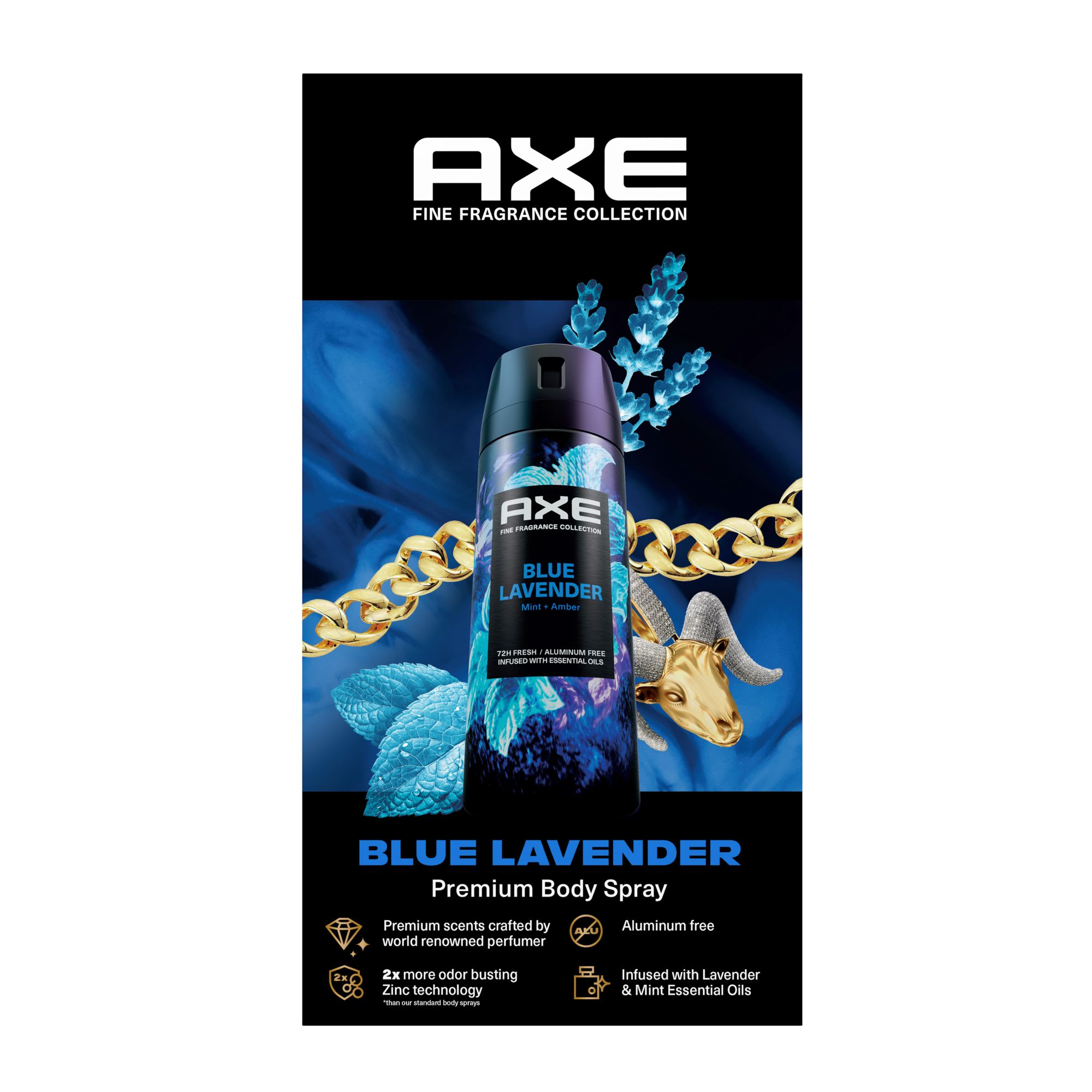 Smell finer than fine fragrances with the G.O.A.T, The NEW AXE Fine Fragrance Collection. 70% of guys in a blind study said they’d replace their fine fragrances with their favorite scent from the AXE Fine Fragrance Collection among Blue Lavender, Aqua Bergamot, and Green Geranium. Surprised? AXE is not. Their world-renowned perfumers have produced a top-tier banger in this Blue Lavender Premium Deodorant body spray for men, with an exhilarating fresh scent infused with lavender, mint, and amber essential oils. Everyone deserves a hype man, so they made one in fragrance form. In just a few spritzes of this deodorant spray, you’ll have 72 hours of freshness and unbeatable confidence. With 2X more odor-busting Zinc technology than their standard body spray, they’re out here working smarter, not harder. This body spray is formulated with an aluminum-free formula that hits different, is easy on the skin, tough on odor, and is instantly refreshing. AXE really thought of everything. Vibing with the Blue Lavender Deodorant Body Spray? Check out AXE Fine Fragrance Collection Blue Lavender Deodorant Stick and AXE Fine Fragrance Collection Blue Lavender Body Wash to stay fresh as ever. That's the AXE effect. IYK, YK. Let’s get it.