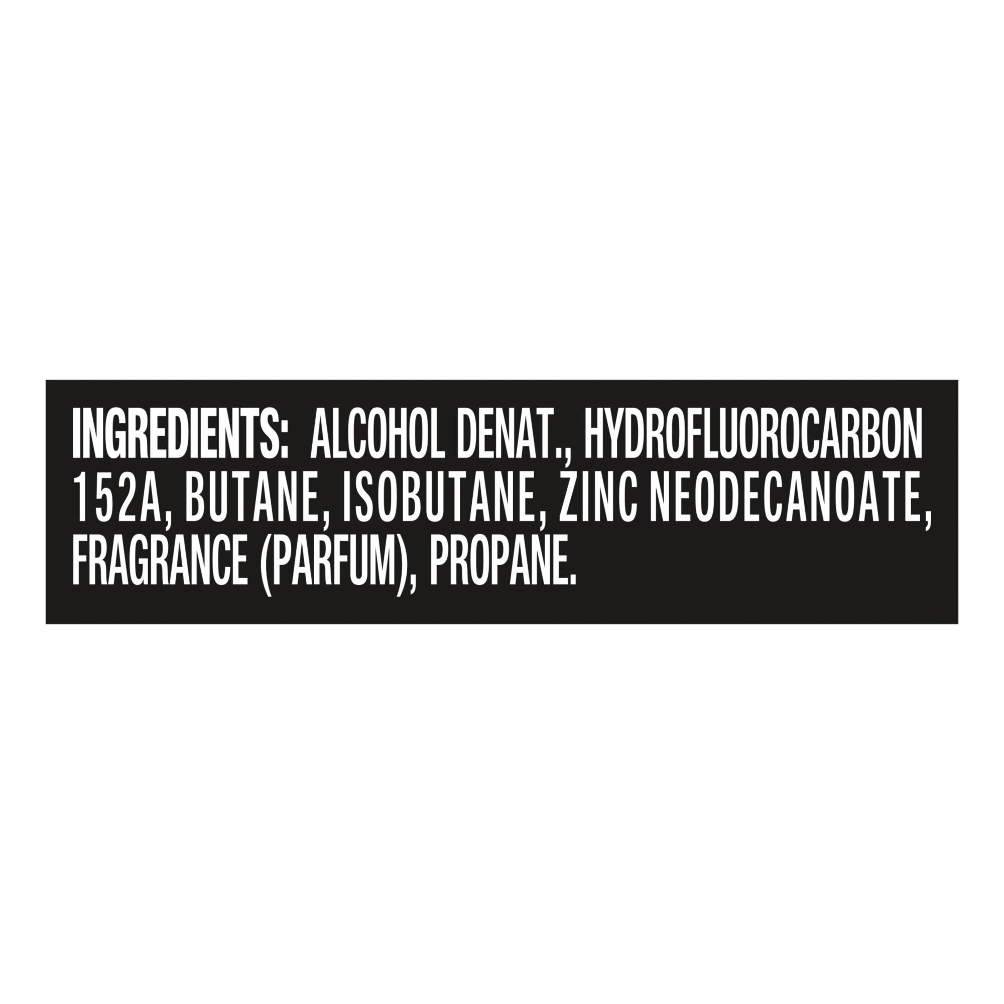 Ingredients: Alcohol Denat., Hydrofluorocarbon 152a, Butane, Isobutane, Zinc Neodecanoate, Fragrance (Parfum), Propane, Alpha-isomethyl Ionone, Citral, Citronellol, Coumarin, Geraniol, Limonene, Linalool.
